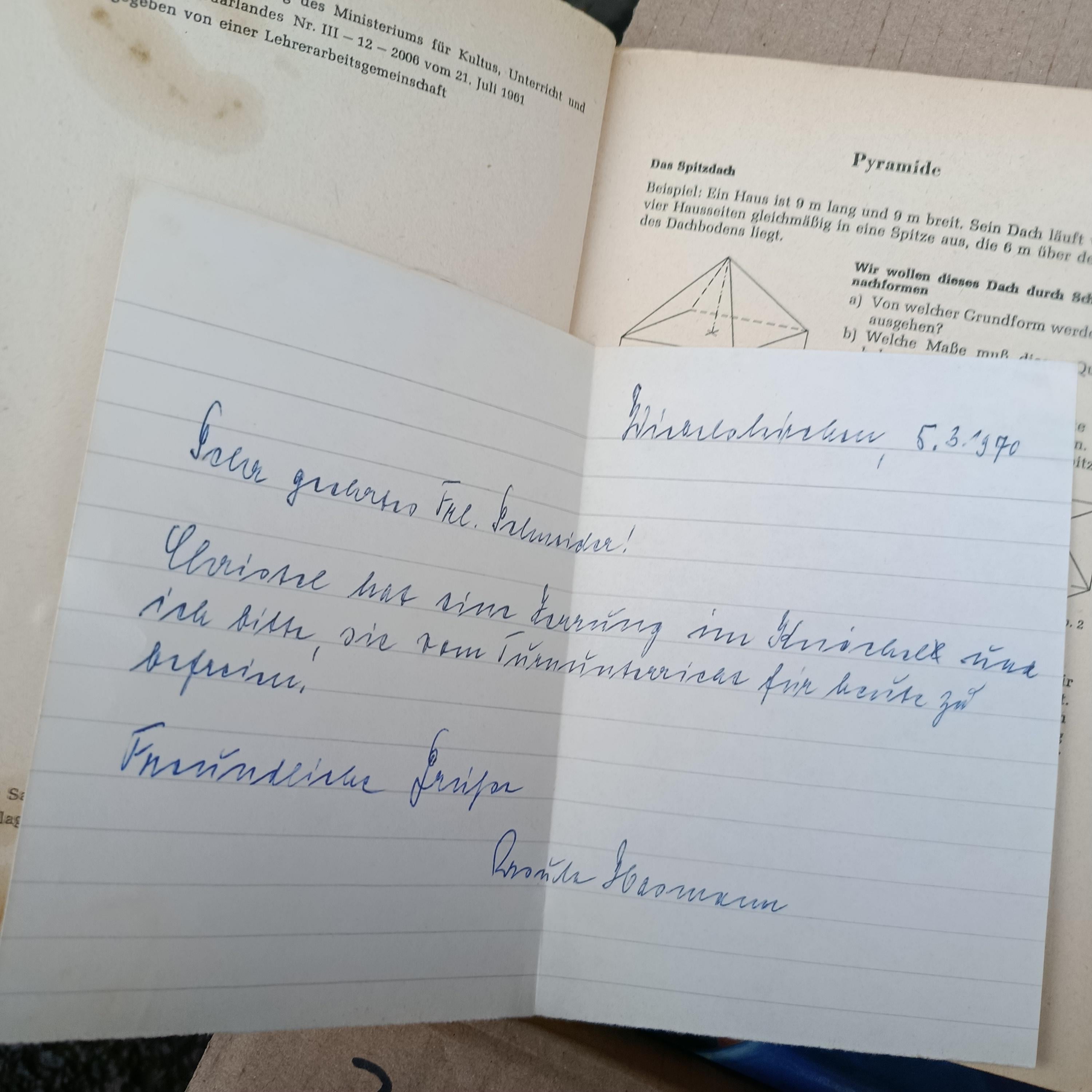Feroc on 24/11/2025 12:21 Wiernsheim, 5.3.1970 Sehr geehrte Frl. Schneider! Ulrike hat eine Zerrung im Knöchel und ich bitte, sie vom Turnunterricht für heute zu befreien. Freundliche Grüße Renate Hermann —- Wiernsheim, March 5, 1970 Dear Miss Schneider! Ulrike has a strained ankle and I request that she be excused from gym class for today. Kind regards, Renate Hermann