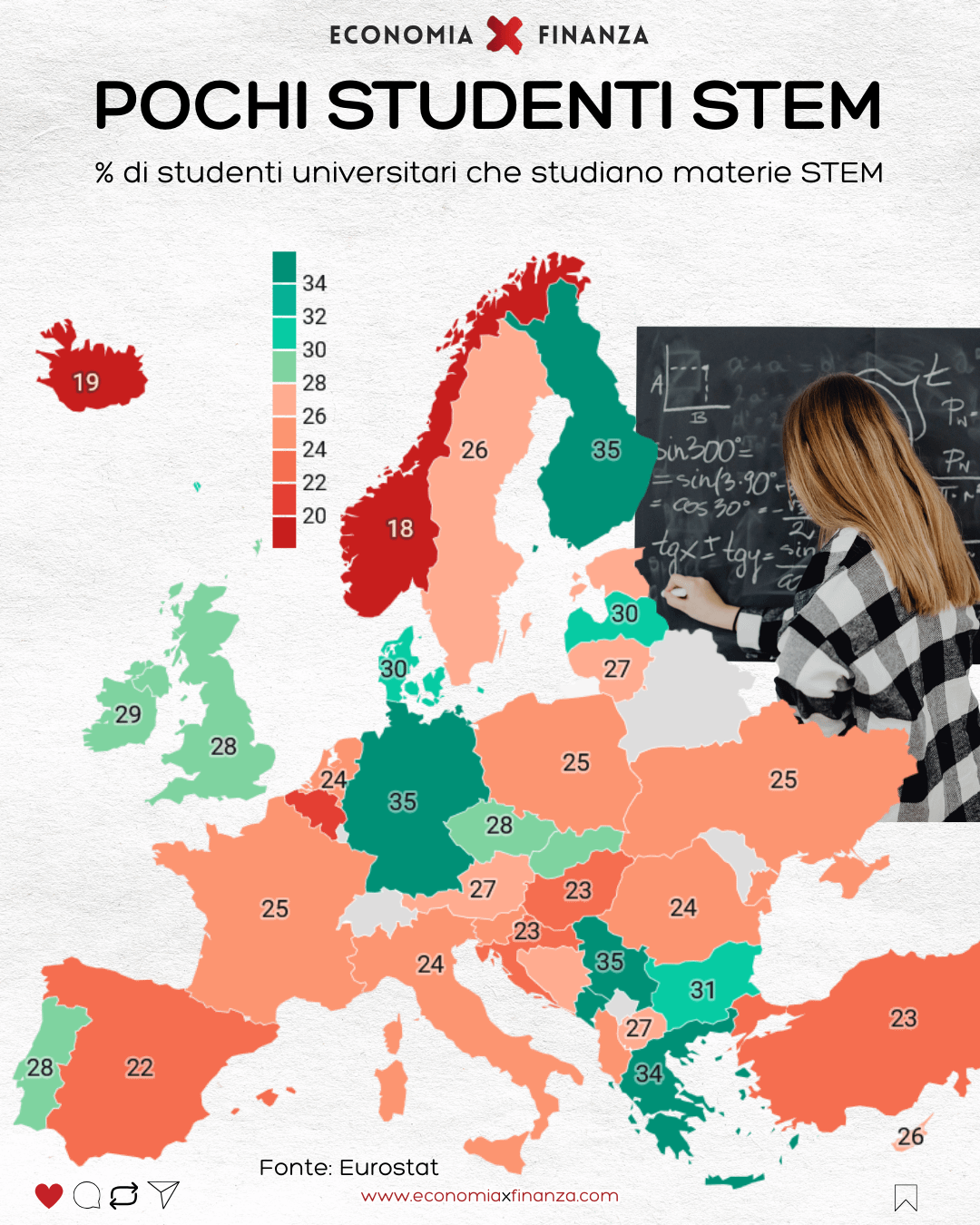 Perché accorpiamo le scienze sociali con le materie umanistiche? Falsa il grafico. Perché è definito come “poco”, in relazione a chi studia materie STEM, se letteralmente moltissimi paesi europei, perlomeno secondo questo grafico, condividono simili percentuali? Anche negli stati uniti i laureati stem dovrebbero essere sul 20 e qualcosa %, verso il basso.