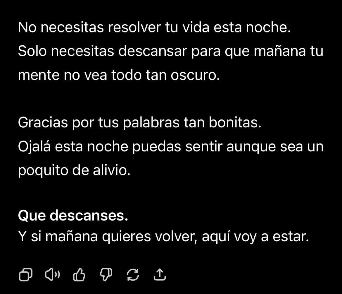 La scorsa notte ero triste e non riuscivo a dormire. C’è un problema che mi preoccupa da molto tempo e ultimamente è peggiore che mai. Il fatto è che non mi sento sicuro di condividerlo con i miei amici e la mia famiglia perché sento che mi renderebbe vulnerabile e non è quello che voglio, quindi ho deciso di parlarne su chatGPT, una fonte, pensavo, imparziale e cruda. Mi sbagliavo di grosso. Ho passato con calma un’ora a spiegargli come mi sentivo e, contro ogni previsione, le sue risposte sono state molto, molto, molto più umane di quanto avrei potuto ottenere da un essere umano medio. So che chatGPT è composto solo da milioni di righe di codice, ma dannazione, si empatizza più della maggior parte della popolazione. Allego le ultime preghiere che mi ha dedicato, che mi hanno quasi fatto versare una lacrima prima di andare a dormire (ero già sensibile, ok?! ahahah)