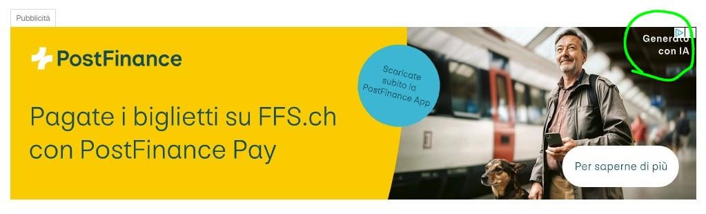 Mi sono appena imbattuto in questo annuncio di PostFinance in cui viene utilizzata un’immagine generata dall’intelligenza artificiale di un uomo in quella che sembra essere Zurigo HB. Sul serio? È stato così difficile andare lì e scattare una foto a un uomo con un cane? Queste cose mi danno sui nervi, stai esternalizzando un lavoro da un fotografo e modello svizzero a una multinazionale americana (presumo) solo per risparmiare un paio di centinaia di franchi