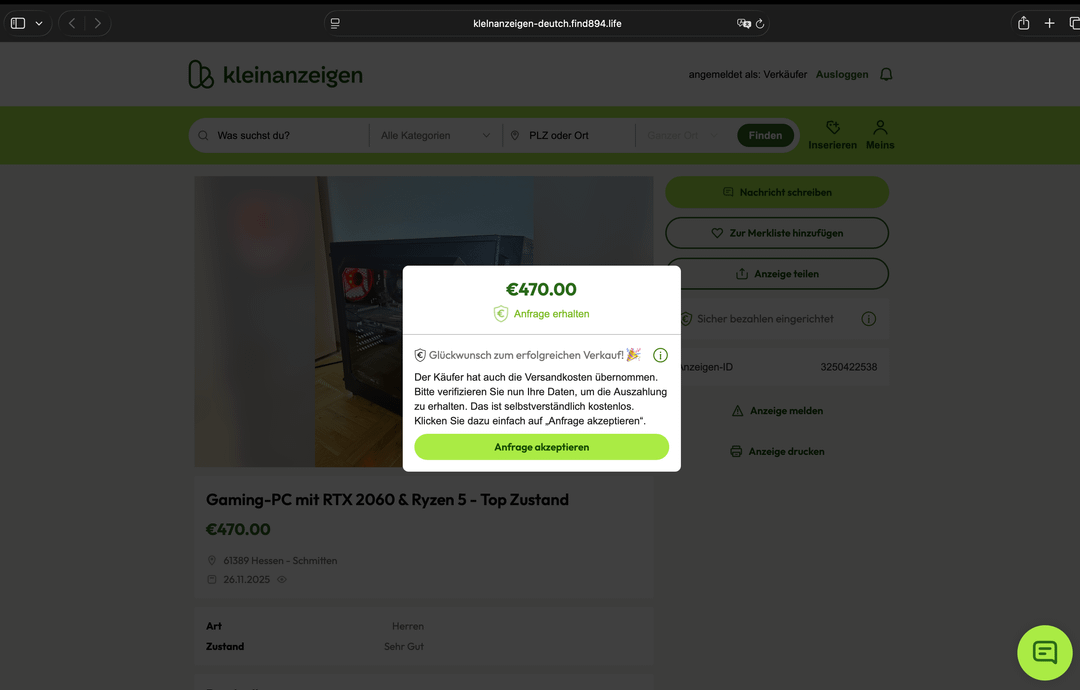 Vendeva il suo PC su kleinanzeigen, il truffatore sembrava molto legittimo e voleva pagarlo con PayPal. Ha detto che non funzionerebbe e che vuole utilizzare il metodo di acquisto diretto per pagare. Ha detto al mio amico di aver inviato il denaro e il mio amico ha ricevuto direttamente un’e-mail in cui si diceva che aveva venduto il suo articolo (Screenshot 1). Se clicchi sul link dovrai fornire il tuo IBAN per ricevere il pagamento. Se lo fai ricevi direttamente la richiesta dal tuo online banking per verificare qualcosa.