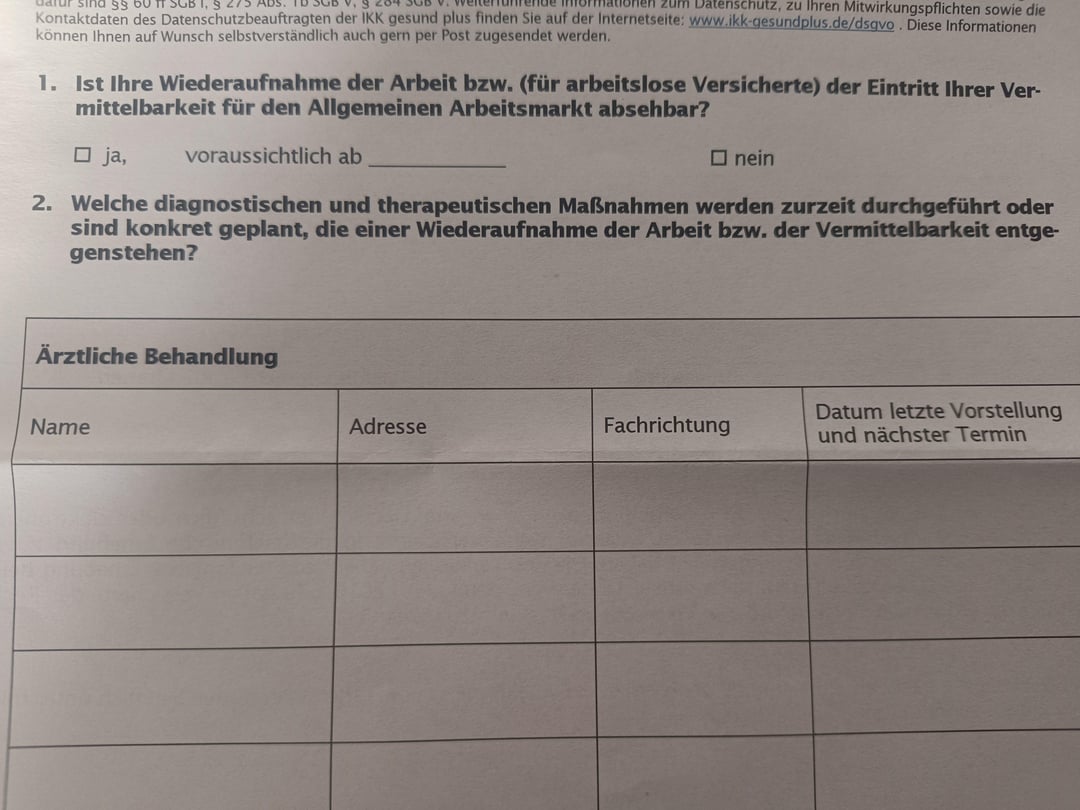 Per la 1) domanda: non sono sicuro per quanto tempo sarò in congedo per malattia poiché è dovuto a problemi di salute mentale, ma non mi sento ancora pronto per cercare un lavoro, anche se sto lavorando attivamente su me stesso, quindi potrebbe trattarsi di uno o pochi mesi, quindi dovrei semplicemente rispondere di no? 2) domanda: per ora il mio hausarzt mi ha prescritto medicine e congedi per malattia, ma faccio anche terapia online nella mia lingua madre (privata), quindi non sono sicuro se dovrei scrivere anche il nome del mio terapista e inserirlo "in linea" come indirizzo oppure dovrei scrivere solo il nome del mio hausartz? Lo stesso con la seconda pagina, dovrei scrivere che seguo una psicoterapia come metodo di trattamento anche se è un medico online, è un metodo valido per loro, dovrò inviargli una prova o qualcosa del genere?