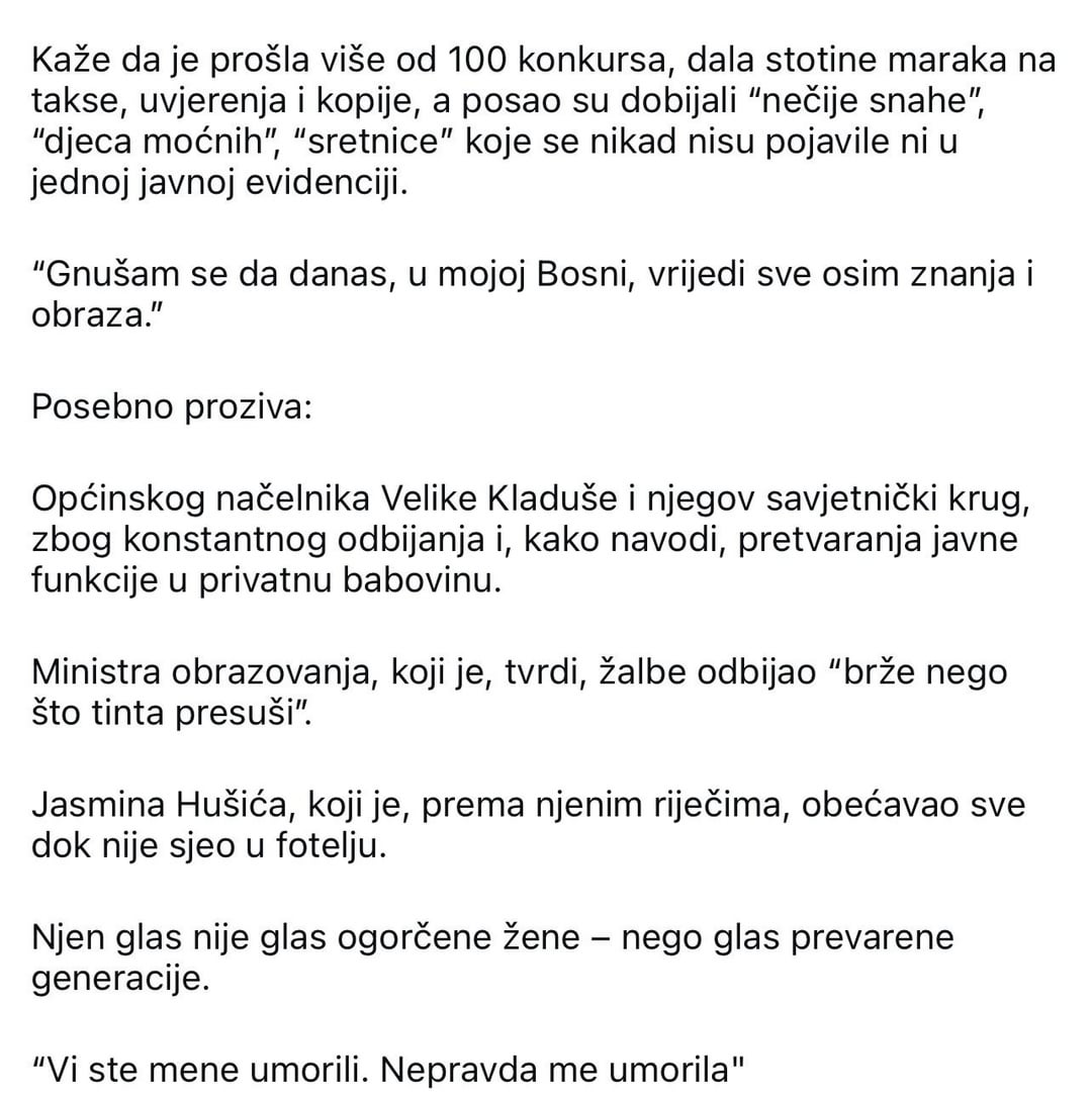 Saluti dal paradiso, mi sono imbattuta in questa storia di Mirela Salkić (foto allegate) e, onestamente, raramente qualcosa mi ha colpito e infastidito in questo modo ultimamente. Brevemente per coloro che non riescono a leggere tutto dalle immagini: Mirela è una studentessa d’oro, insegnante e figlia di un combattente deceduto smobilitato, Kasim Salkić. La donna fa le valigie e lascia la BiH.