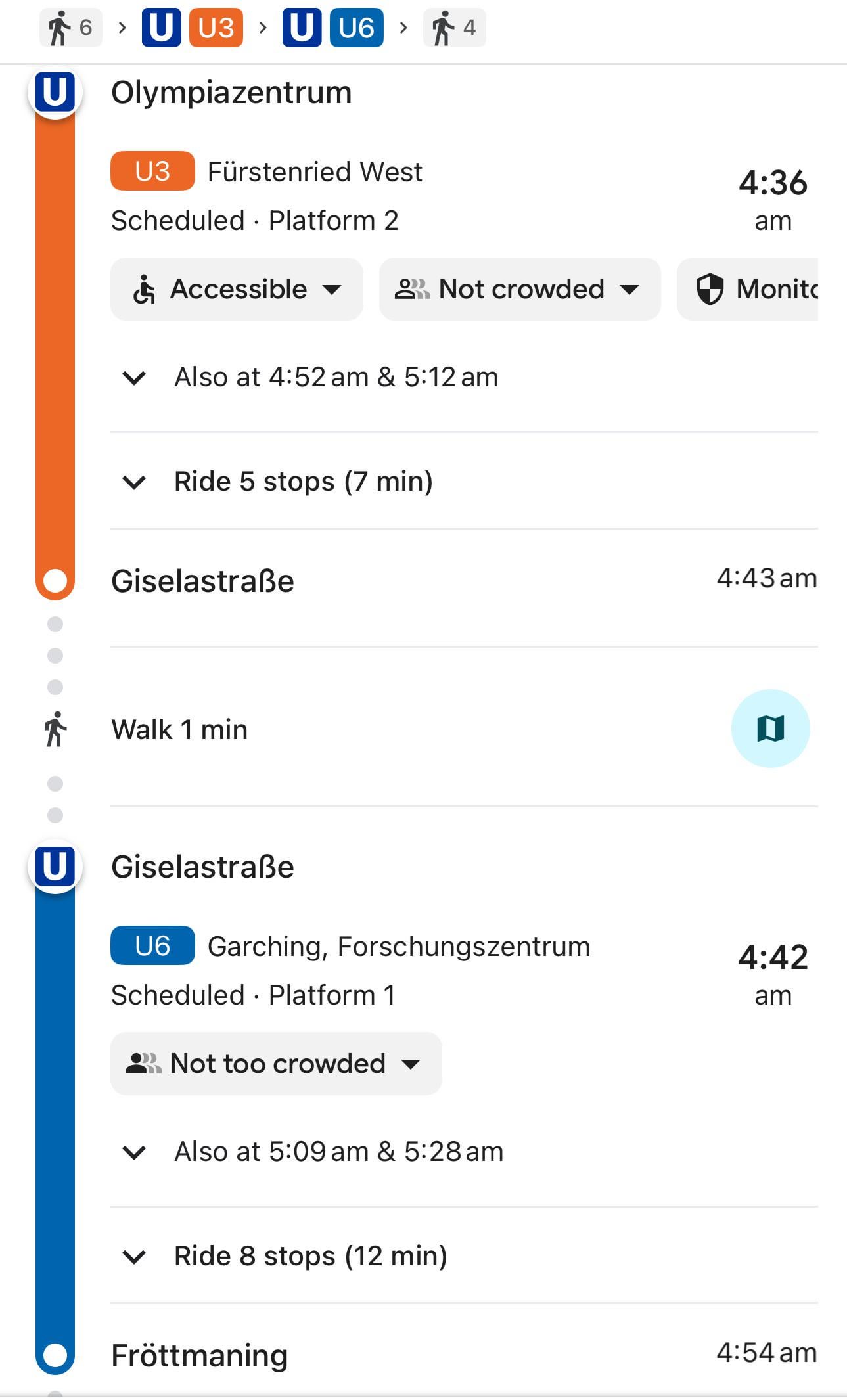 ad ogni modo, quali sono le possibilità di prendere l’U3 fino all’U6 a giselastraße? so che l’U3 arriverà alle 4:43, ovvero un minuto prima della partenza dell’U6 (4:42), ma ho notato che con gli U3 e gli U2 aspettano l’arrivo dell’altro prima di partire. è lo stesso per U3 e U6?
