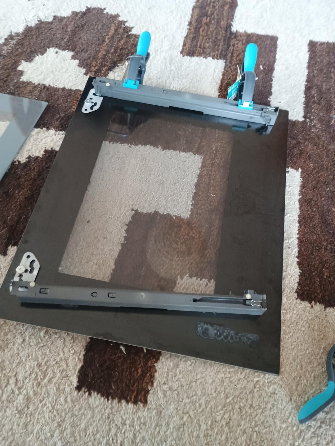 Le staffe vanno tra i pannelli di vetro esterni ed interni della porta. Constructa offre solo la visita di un tecnico per € 119 + costi di riparazione, o una porta sostitutiva completa per € 300+ (anche questo attualmente non disponibile). Si sono anche rifiutati di dire quale adesivo usare, o addirittura di riparare se porto i pezzi a Monaco. Siamo un gruppo di studenti e preferiremmo non spendere molto.