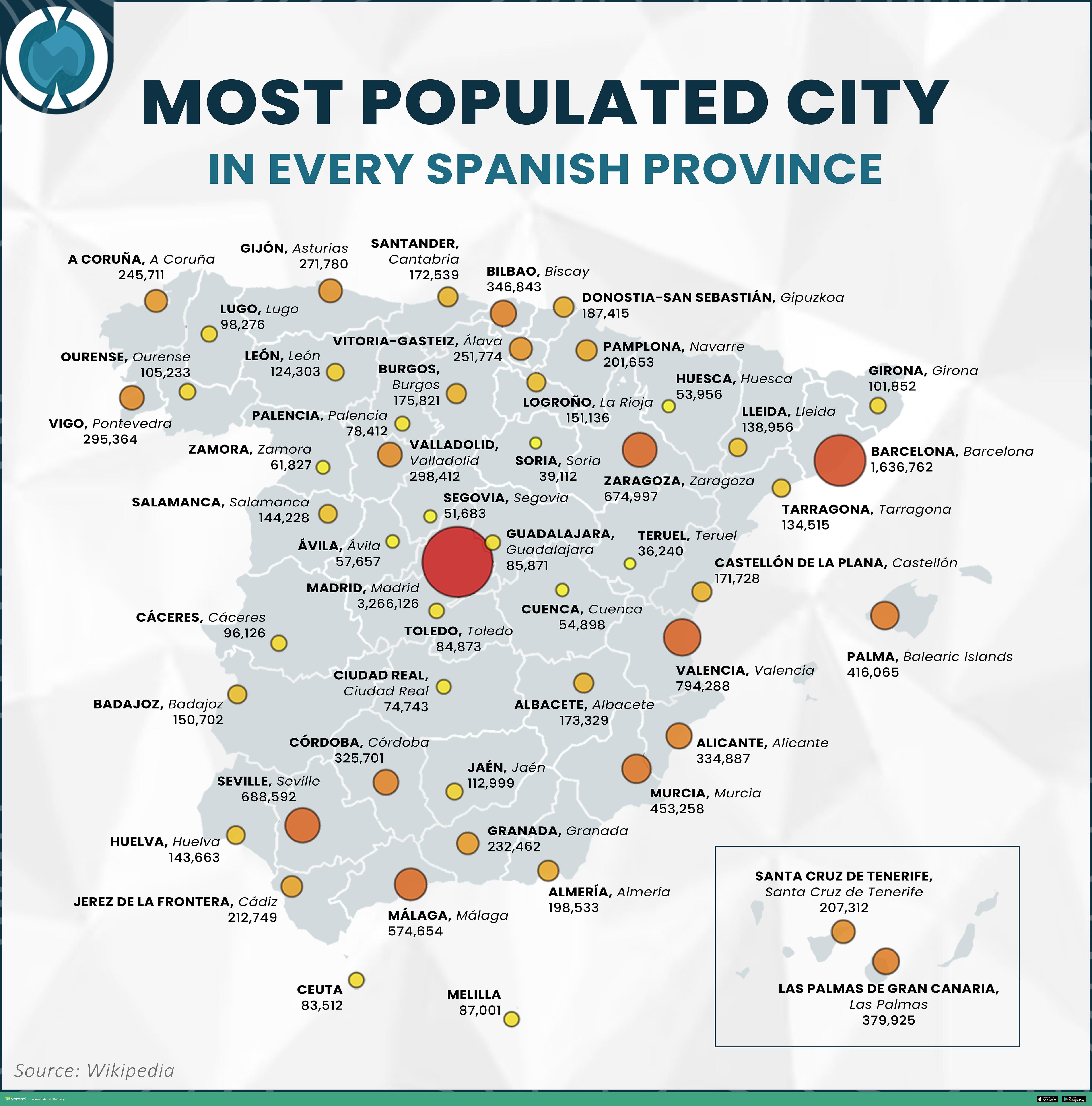 La distribución demográfica de España presenta un estudio de caso notable sobre la macrocefalia y el fenómeno de la “España Vacía”. Un análisis geoespacial revela una estructura polarizada: un enorme centro neurálgico en Madrid (3,26M) rodeado por una meseta interior escasamente poblada, la cual está a su vez circundada por una densa periferia costera. La población de Madrid por sí sola supera el total combinado de las tres siguientes capitales de provincia más grandes (excluyendo Barcelona, Valencia y Zaragoza), destacando una intensa centralización del capital humano y la actividad económica en la capital.