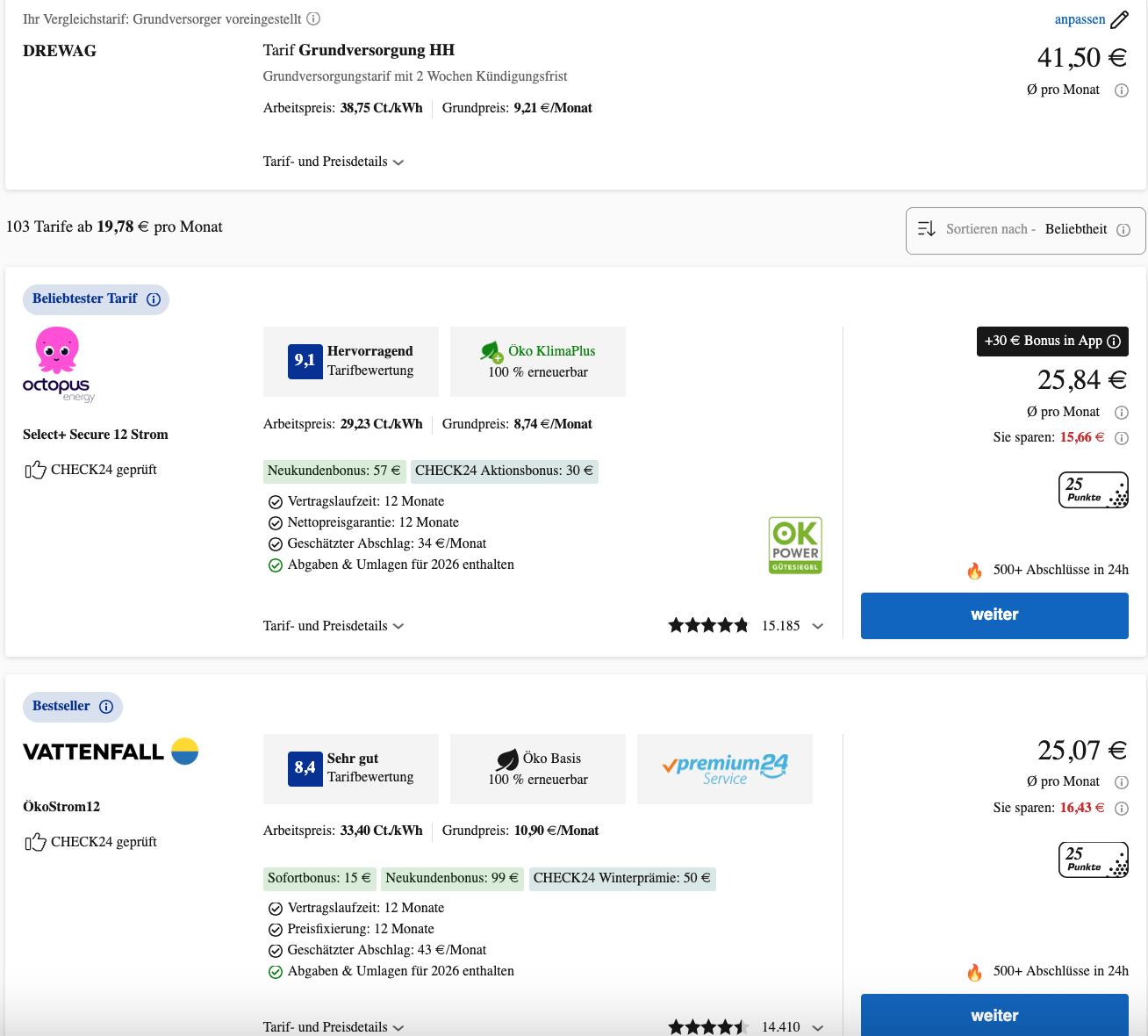 Questa è la prima volta che pago l’elettricità da solo. Non sono sicuro al 100% di come funzioni, c’è una bella differenza tra la compagnia elettrica locale (41,50€) e le altre che ho trovato sul sito Check24. Mi chiedevo se ci sono costi nascosti o qualcosa a cui dovrei prestare attenzione.