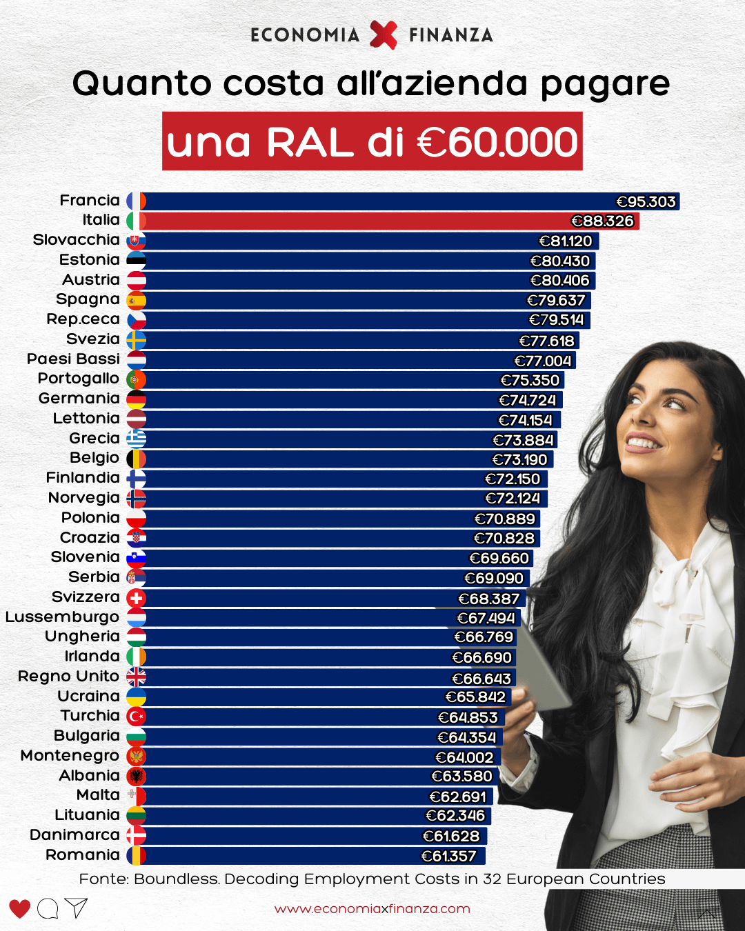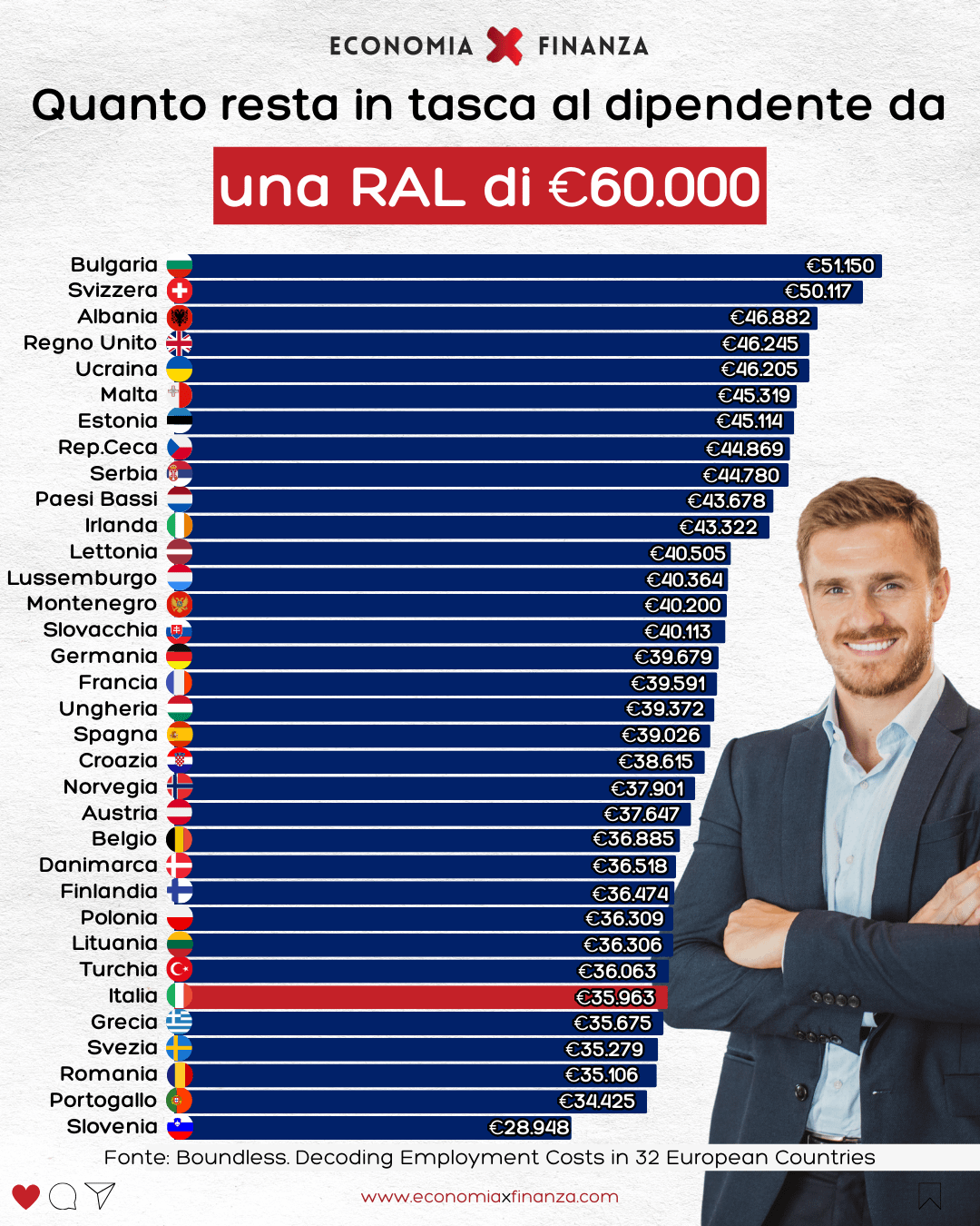 Con 60k ti restano ~37.5k netti, quindi sopra il Belgio, mentre il costo aziendale è sotto gli 85k. Come sono stati calcolati questi valori?