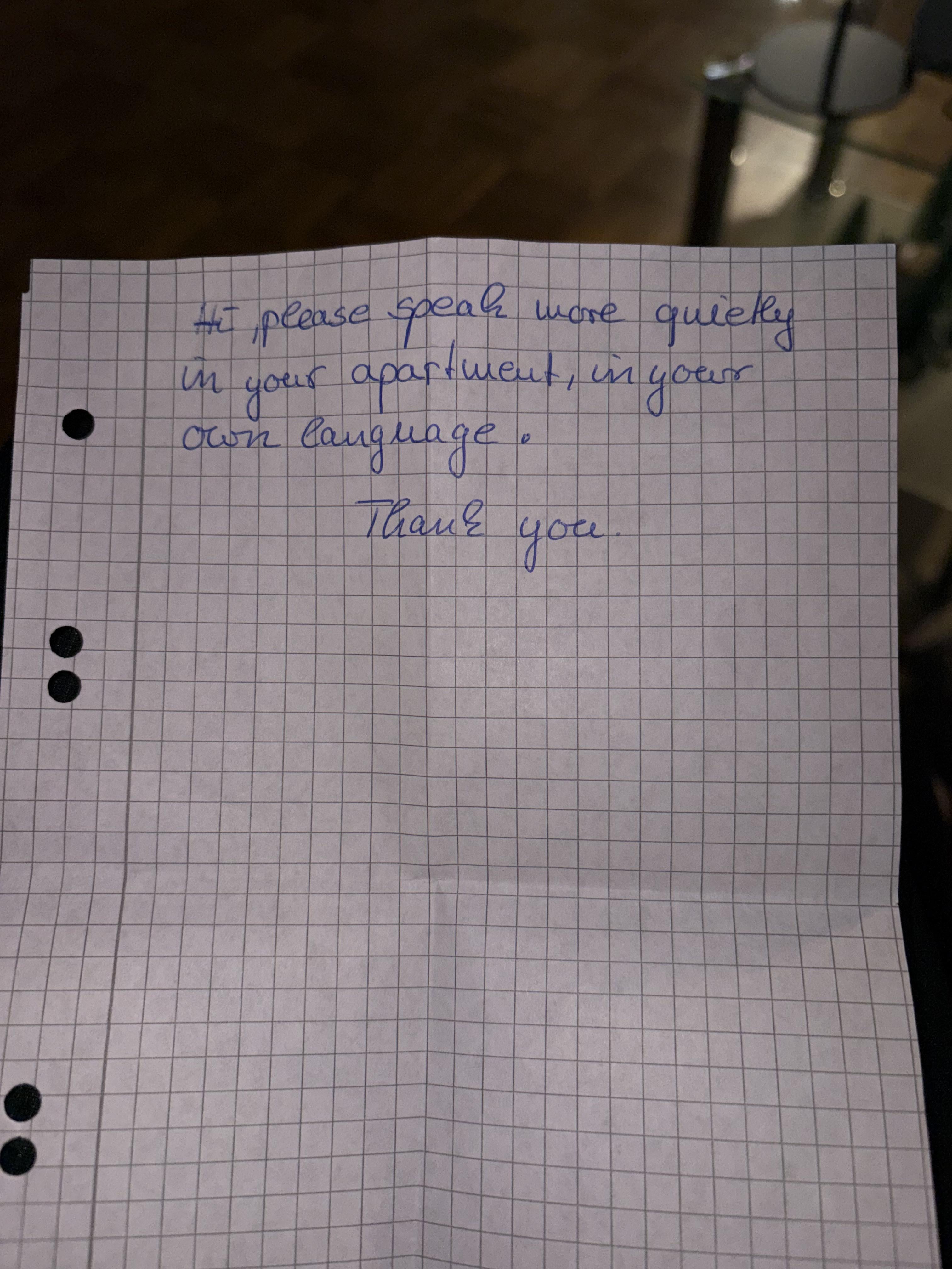 Mi congratulo con la bella calligrafia, quindi difficilmente diamo per scontato che sia una donna, inoltre è stata abbastanza intelligente da non menzionare il suo nome per non finire nei guai legali, ma trovo divertente come abbia cercato di coprire il piccolo razzismo iniziandolo come una “denuncia per rumore”, ma fa letteralmente in modo di non parlare tedesco nel mio appartamento 😂