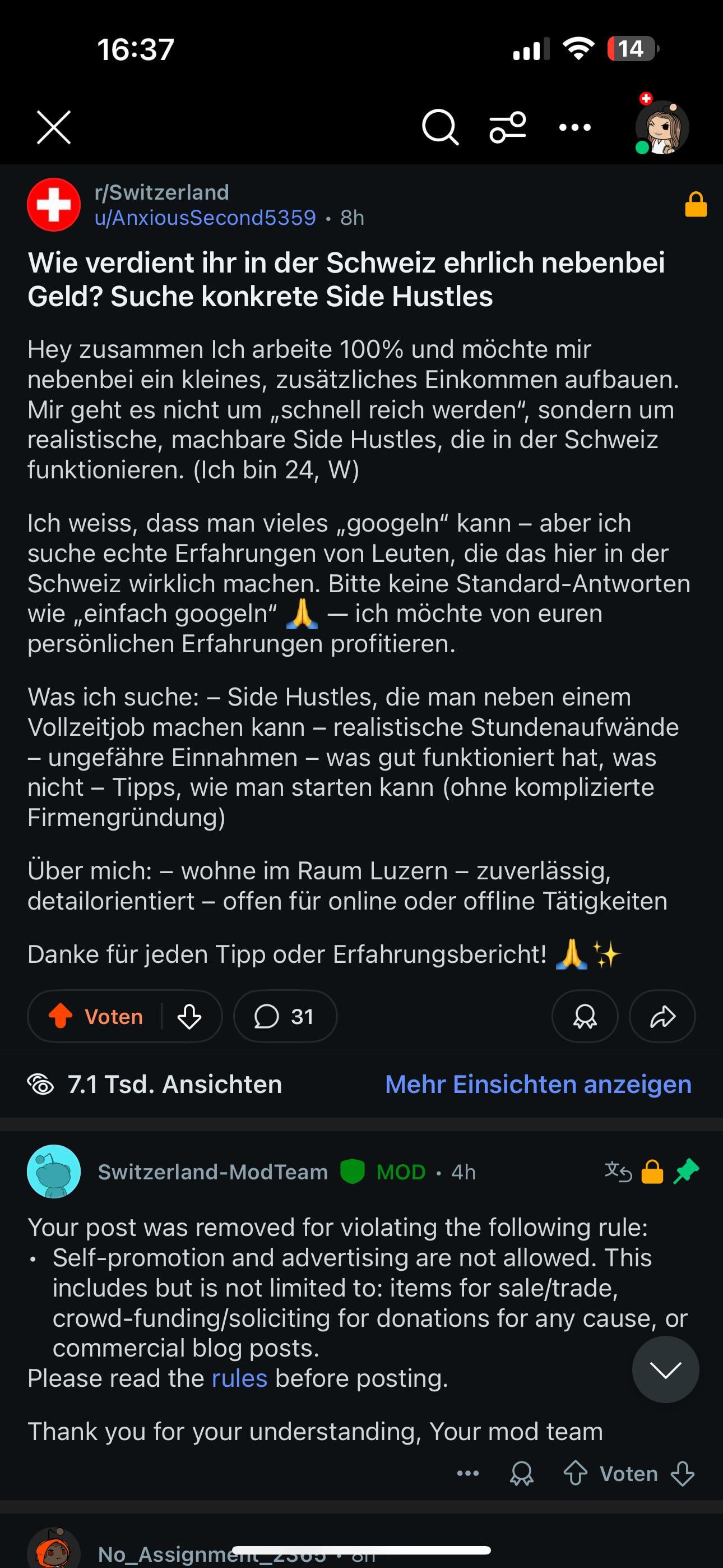 Ehi zeme, il mio post originale in cui chiedevo di Side Hustles in Svizzera è stato rimosso dal team di mod con “Autopromozione/Pubblicità”.