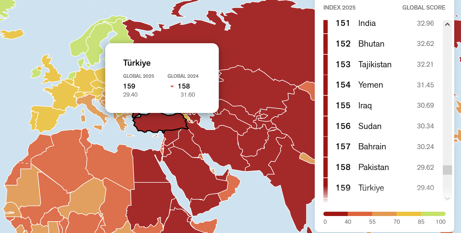 Secondo la valutazione annuale di RSF, nel 2025 la Turchia è scesa di un’ulteriore posizione, arrivando al 159° posto. Con questa posizione è rimasta indietro rispetto a Yemen, Sudan, Pakistan, Libano, Congo, Somalia e molti paesi che attualmente stanno vivendo una guerra o un conflitto civile e quelli che hanno subito un colpo di stato quest’anno. I paesi che sono in ritardo rispetto alla Turchia e invidiano la democrazia e l’ambiente di libertà nel paese sono: Venezuela, Cambogia, Arabia Saudita, Palestina, Emirati Arabi Uniti, Cuba, Bielorussia, Azerbaigian, Gibuti, Myanmar, Egitto, Russia, Nicaragua, Vietnam, Turkmenistan, Afghanistan, Iran, Siria, Cina, Corea del Nord, Eritrea.