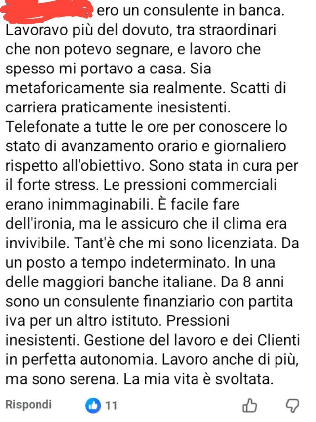 Ho pubblicato questo post perché sono abbastanza indignato. Mi chiedo come sia possibile che noi clienti non siamo mai padroni dei nostri soldi e mi interrogo se queste dinamiche che si creano in queste aziende siamo o meno tossiche per noi clienti. A chi non è mai capitato di ritrovarsi in banca per una cosa e trovarsi davanti un consulente che cerca di intortarti per vendere qualcosa a tutti i costi? Io credo che con i soldi non si gioca e non si può essere vittima di queste dinamiche commerciali. Credo che la polirica debba intervenire a tutela dei correntisti, visti soprattutto gli scandali che ci sono stati in passato che hanno portato lavoratori e pensionati a perdere tanti soldi!