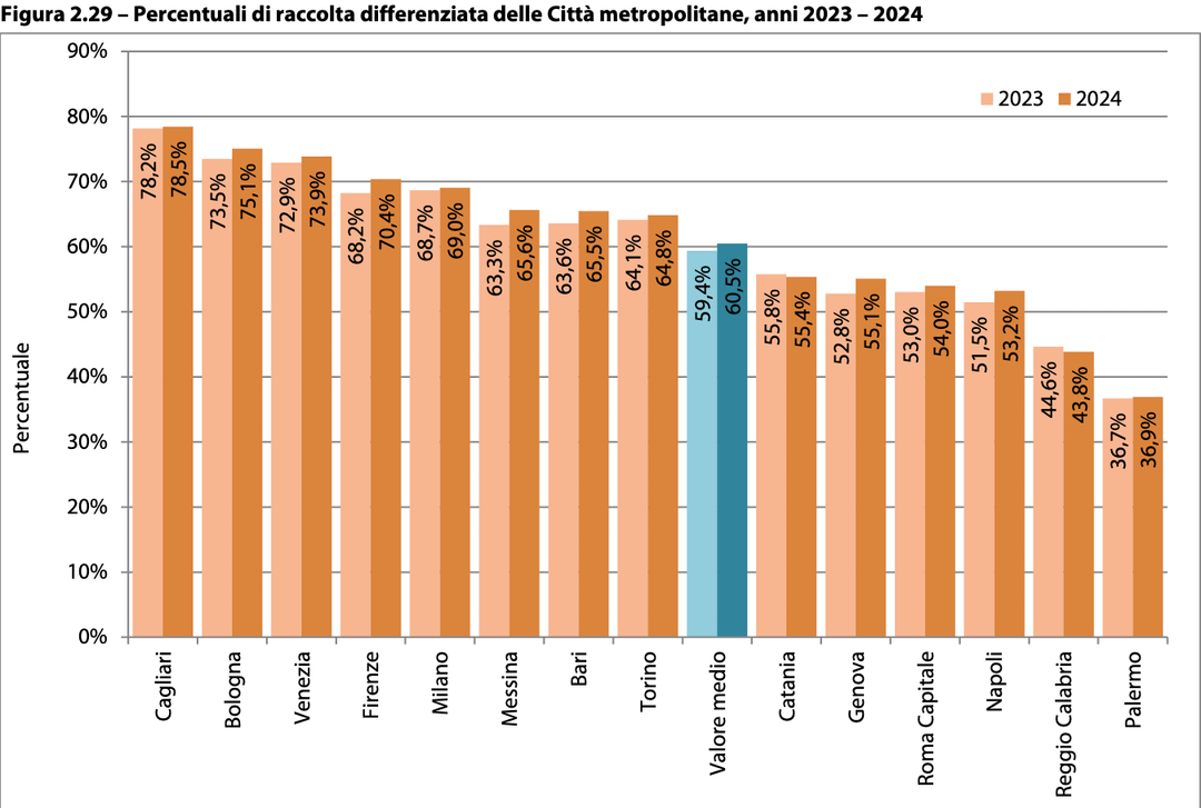 Report ISPRA 2025 – Dati % raccolta differenziata per regione, città metropolitana, top 30 province italiane a fine 2024