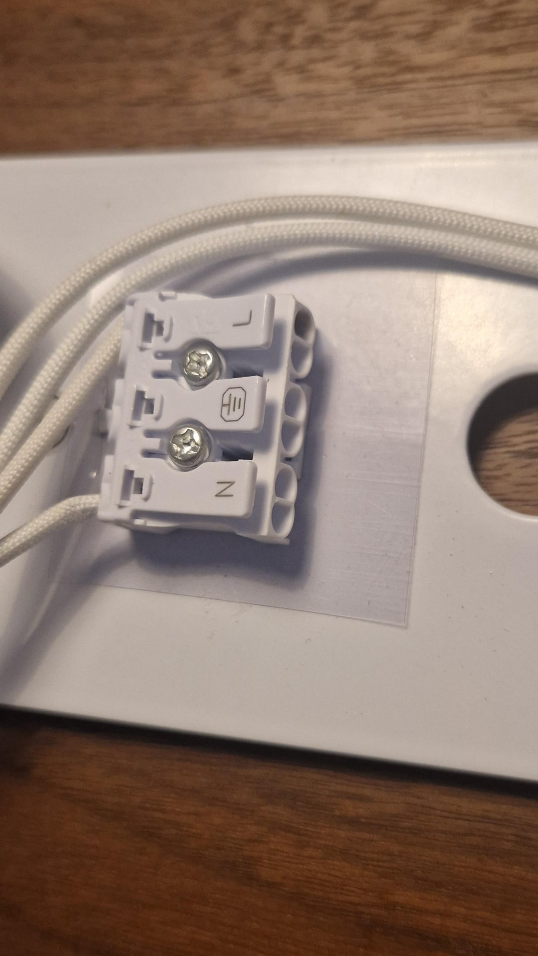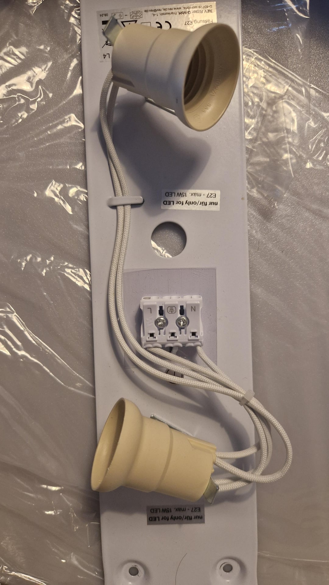 La luce ha 2 blub e 6 plug-in (come nella foto), di cui suppongo 2 siano L (Live), 2 siano G (Ground) e 2 siano N (Neutral) – potrei sbagliarmi, ma sembra indicato come tale.