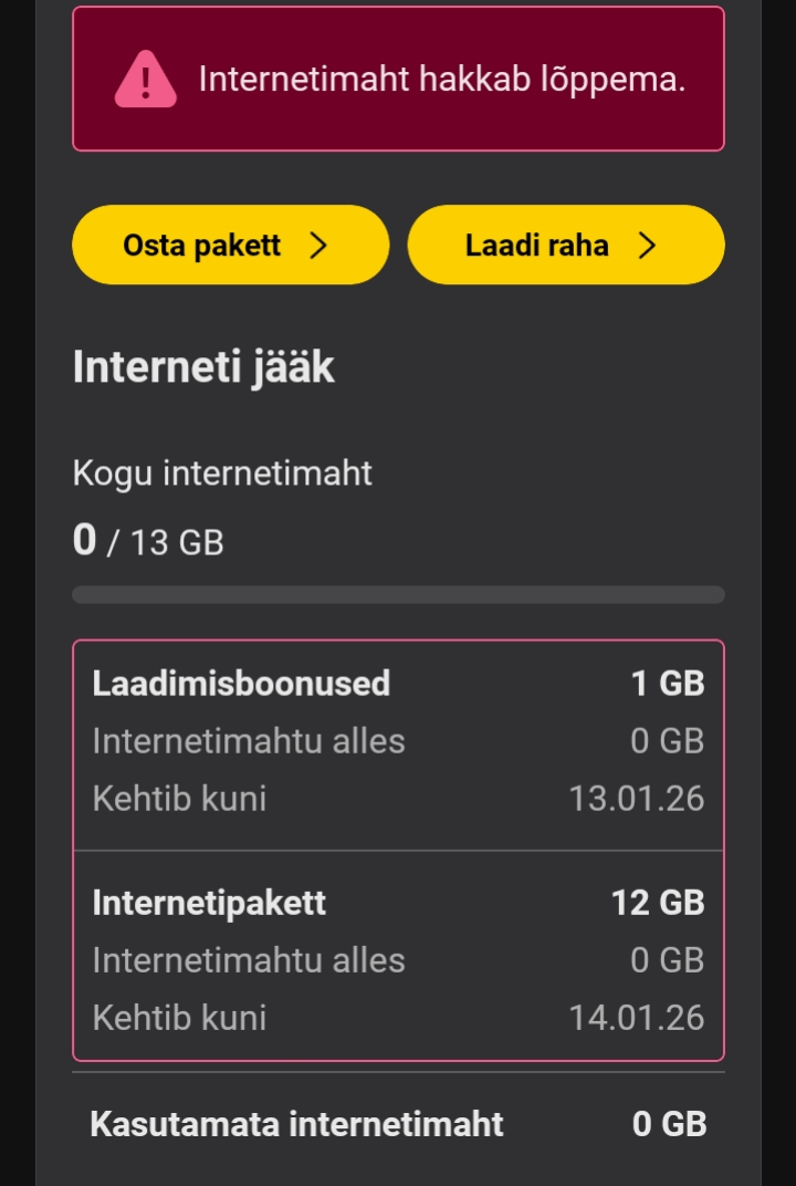 Vanasti Superit kasutasin siis saigi kohe kaks paketti korraga tellitud, mis liitis andmemahu kokku. Arvatavasti jah äpp peksab segast sul. Samas sellel andmemahul ka mingi tähtaeg, kas mitte kuu aega ei olnud peale tellimist?