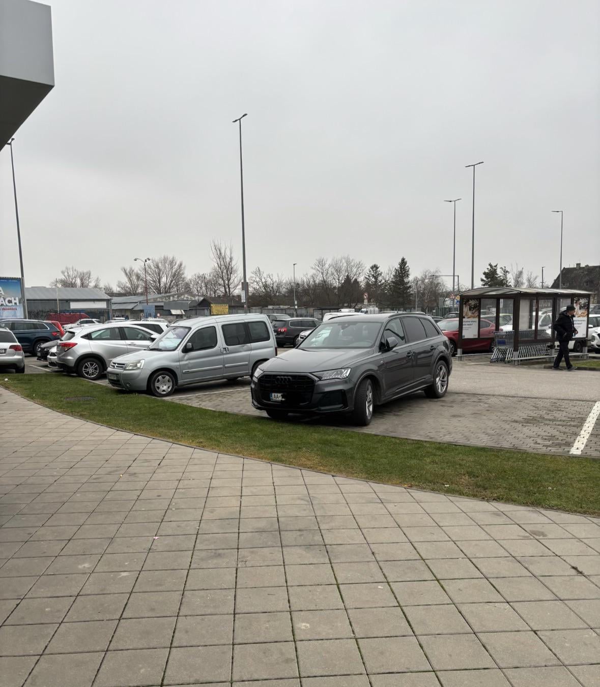 La foto è dell’OC Vajnoria. Il caccia con il q7 ha parcheggiato su 2 spazi, mentre entrambi gli spazi sono circa mezzo metro più larghi di un parcheggio standard (chi conosce le tasse di parcheggio lo sa sicuramente, ma quegli spazi sono grandi), è un vero problema, ma in realtà sono grandi quanto gli spazi per portatori di handicap. La linea che divide i parcheggi passa esattamente al centro dell’auto in questione.