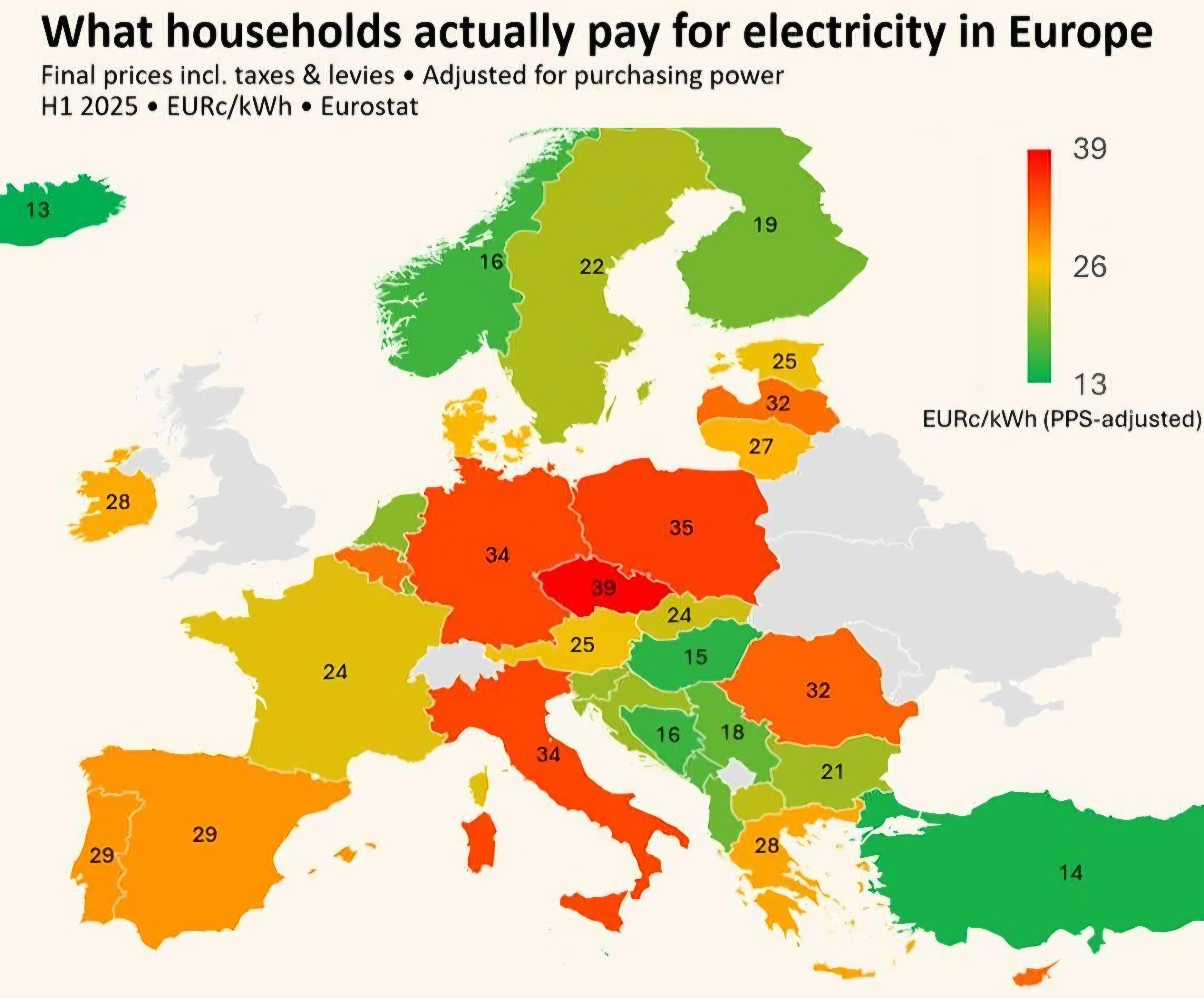 La mappa mostra i dati sui prezzi dell’elettricità adeguati al potere d’acquisto delle famiglie per la prima metà del 2025.