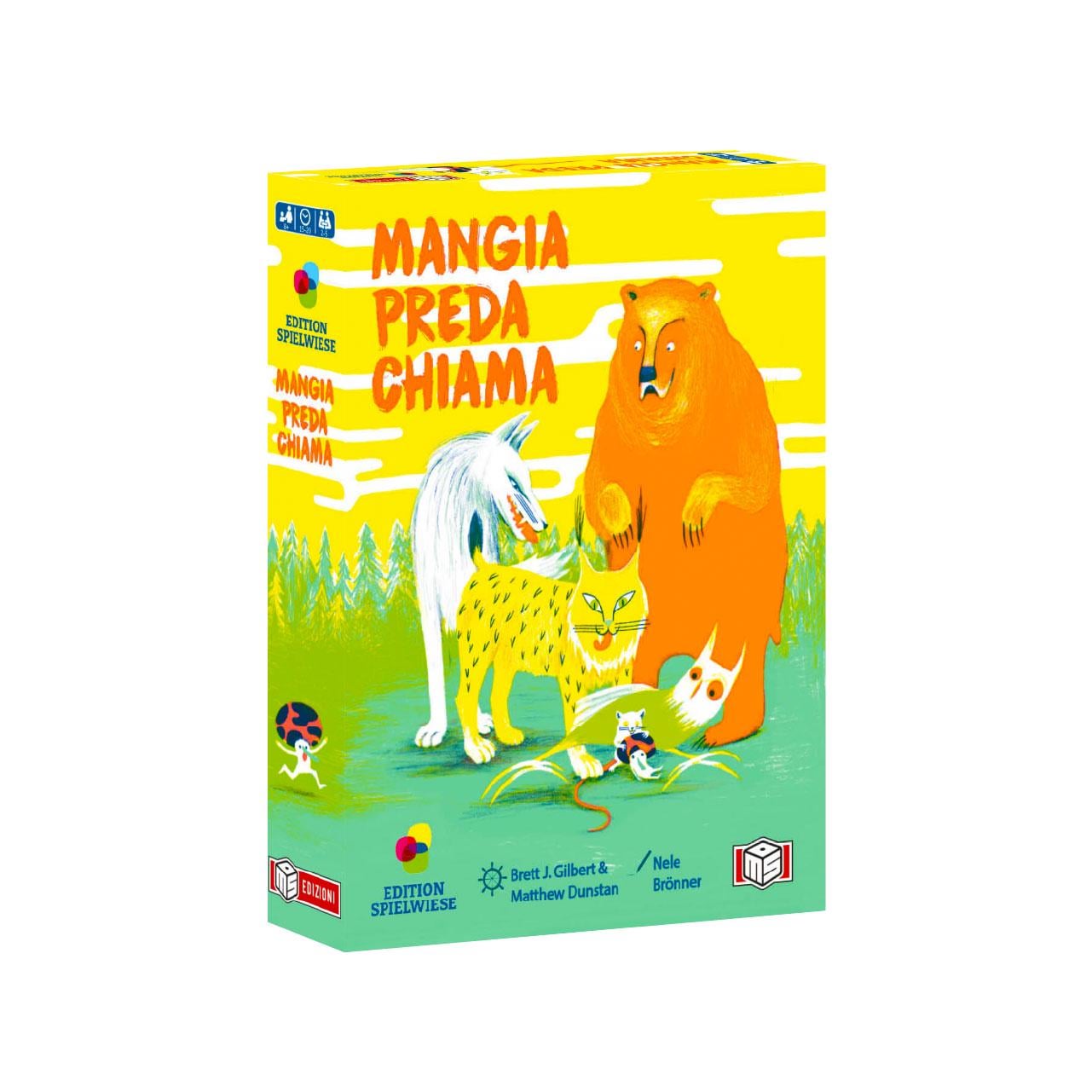 - Mangia preda chiama è un gioco di carte veloce basato su scelte simultanee, bluff e deduzione: a ogni turno i giocatori selezionano segretamente un animale cercando di prevedere le mosse altrui nella catena alimentare. Le risoluzioni sono immediate e premiano lettura del tavolo e tempismo più che pianificazione a lungo termine, con un pizzico di cattiveria. Un filler leggero ma teso, dove le meccaniche semplici creano interazione diretta e colpi di scena continui.