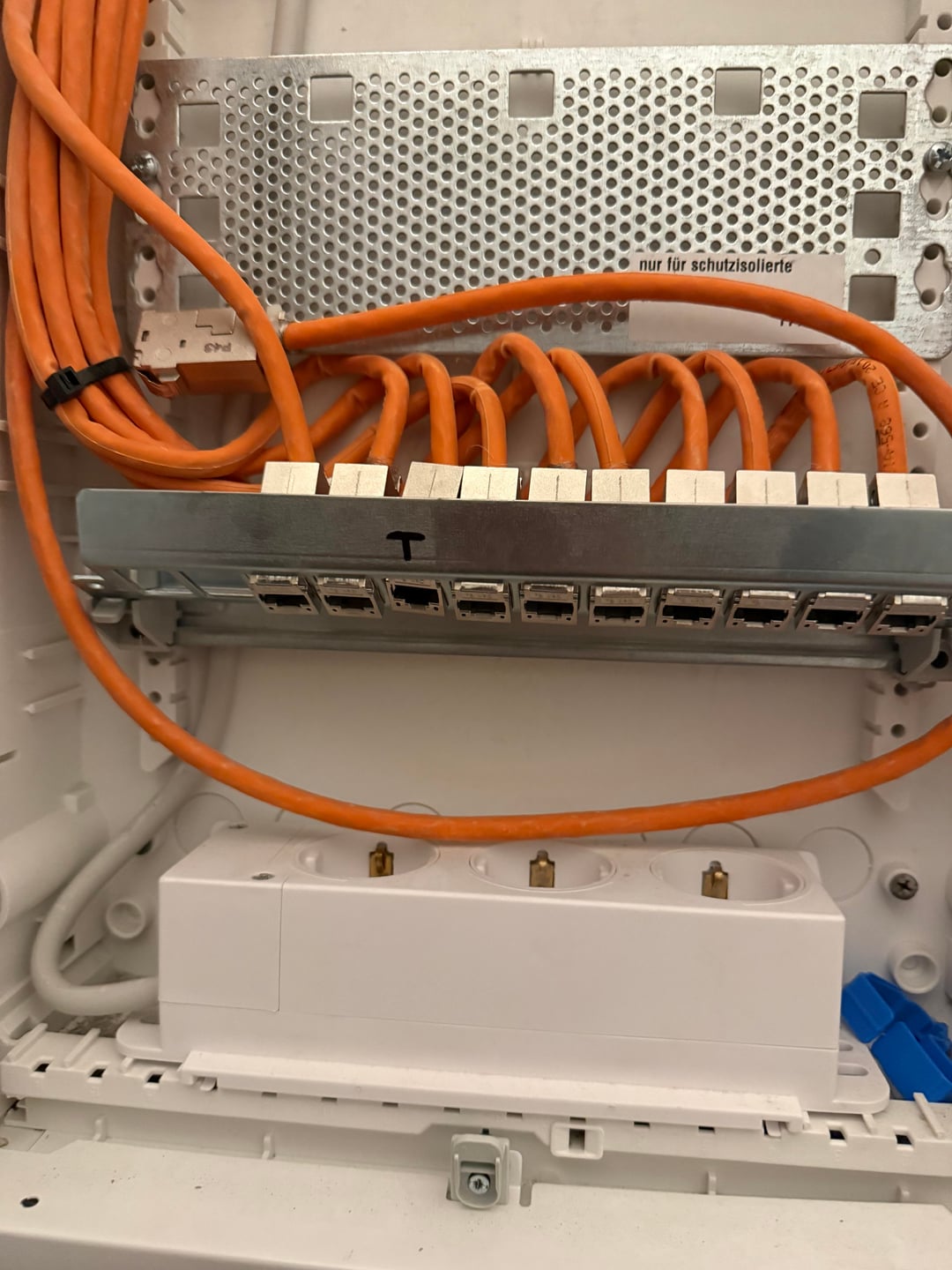 Sorry I’m getting ahead of myself. (Just can’t stop envying that you have so many hardlines to distribute your network throughout your apartment. That’s very uncommon.) But yes, all I see in that photo is your network caninet (or structured media cabinet or “Unterputzverteiler”), with what appear to be 11 Cat6 cables terminated in keystone blocks. (Which is very much the correct way to do such an install. About the only change I’d make is to have also used “smurf tube” but perhaps they have and it’s just not visible in this photo.) That’s an uncommonly high number of cables (in comparison, my current unit only has three, one for each main room) so I’m super curious where they’re all going. Does your place have many rooms? Or perhaps they’ve run multiple cables to each room? In any case, what I *don’t* see in this photo is a TAE socket. Or indeed, anything that appears to be a connection for incoming Internet service.