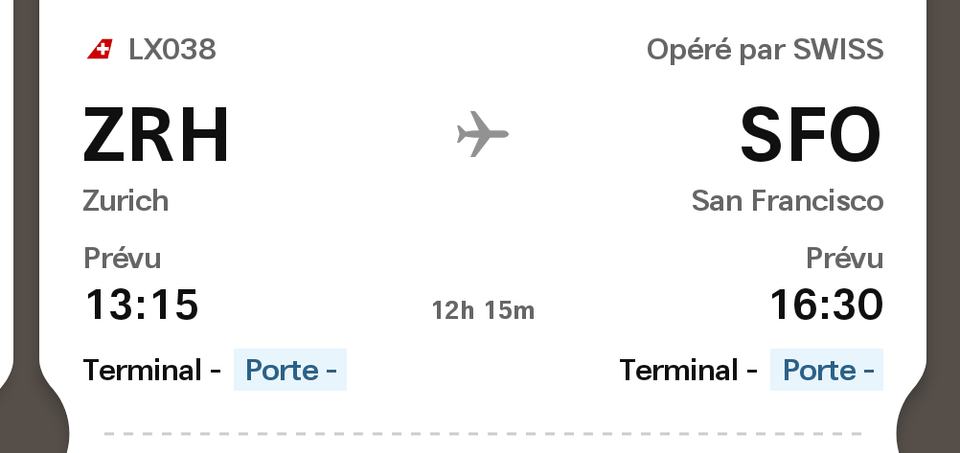Ho prenotato un volo da Ginevra a San Francisco con coincidenza a Zurigo (GVA → ZRH → SFO). Questo itinerario era più economico che prenotare solo la tratta ZRH → SFO e vivo a GVA, quindi aveva senso.