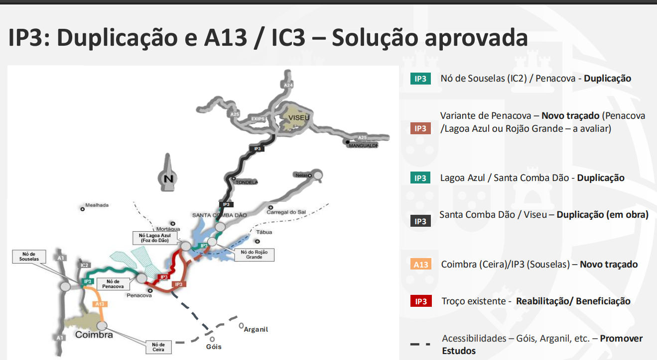 In conformità con l’opzione difesa dalle comunità intercomunali (CIM) di Viseu Dão Lafões e Coimbra, che vogliono rendere più sicuro il collegamento tra le due regioni, il Consiglio dei Ministri ha approvato le soluzioni di duplicazione dell’IP3, trasformandola in una strada a profilo autostradale, e di creazione di un nuovo tracciato sulla A13, tra la "Nodo Souselas" e Ceira – entrambe località nel comune di Coimbra. Ma questo venerdì, presentando i dettagli dei lavori, che costeranno complessivamente 502 milioni di euro, Miguel Pinto Luz, ministro delle Infrastrutture, ha detto che non è stato ancora deciso se le nuove strade saranno a pedaggio.