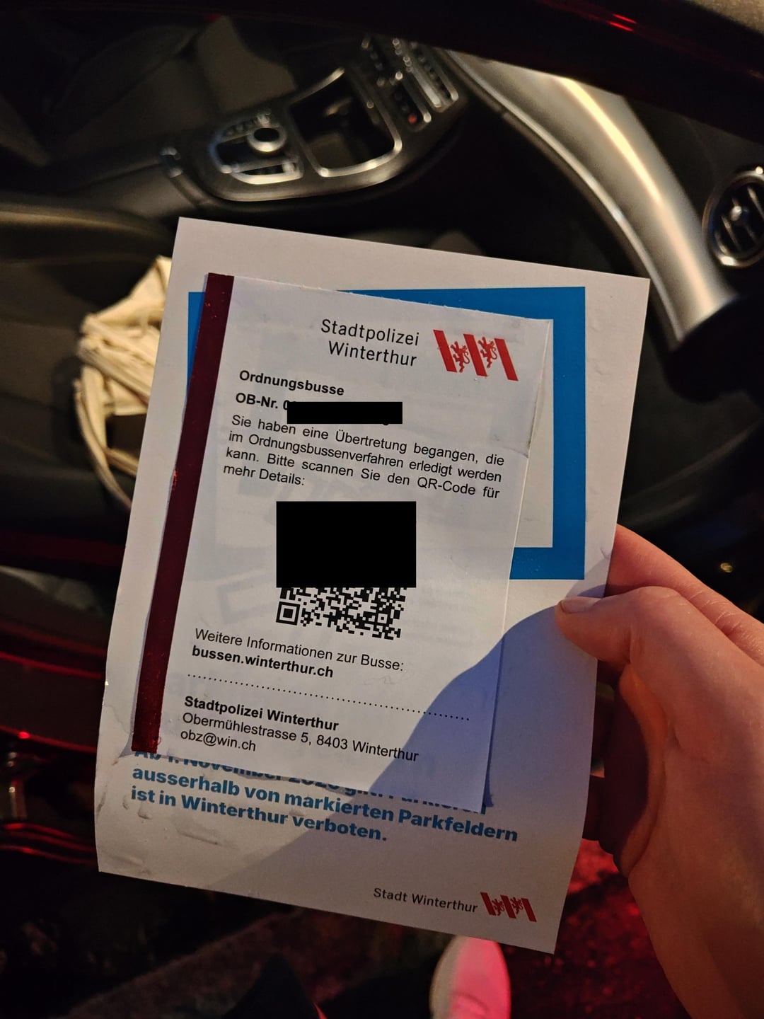 La mia auto è stata multata dalla polizia di Winterthur, che ha affermato che era parcheggiata in una zona vietata, con riferimento alla zona blu. Tuttavia, ciò è avvenuto chiaramente al di fuori della zona blu (i segnali della zona blu iniziano 200-300 m più avanti) e non c’era nessun altro segnale di divieto di parcheggio che giustificasse la multa. Dopo aver contattato la città, è stato confermato che la località in questione non fa effettivamente parte della zona blu. Inoltre, le altre auto lì parcheggiate non risultavano avere multe poste sotto i tergicristalli; solo la mia auto, che ha targa straniera, è stata multata.