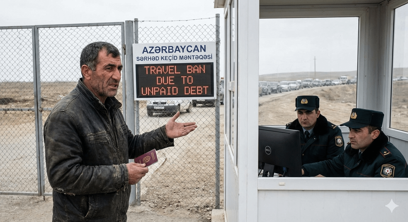 Tutti sanno che la libertà di movimento, che in Azerbaigian è un diritto costituzionale, può essere limitata anche per un debito non pagato di 100 manat. Con le ultime modifiche apportate nel giugno 2025, non appena il tribunale prende una decisione, l’uscita è vietata immediatamente e il debito non viene cancellato finché non viene completamente saldato sull’atto esecutivo.