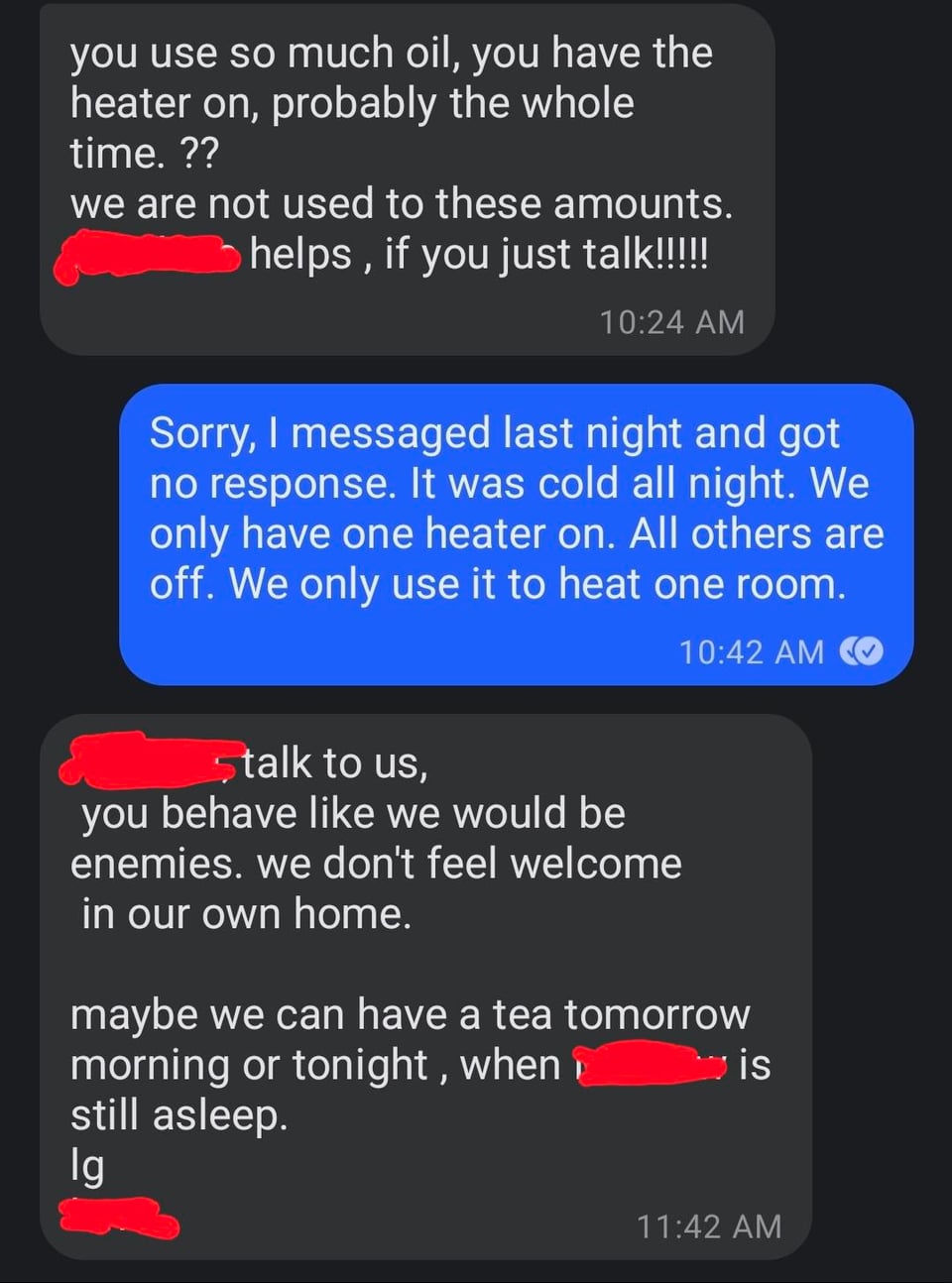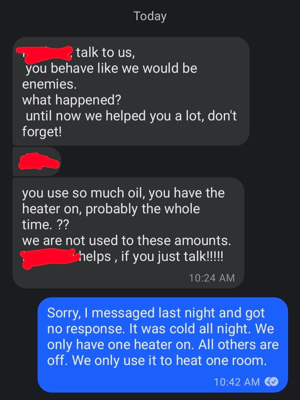 Both of you have valid points. This is not abuse. Go turn the heater off, make them a cup of tea and fugure out together if the counter is still working and is there a leak or whatever. Call a hausmeister too. Call anyone who knows anything about oil heating ffs.