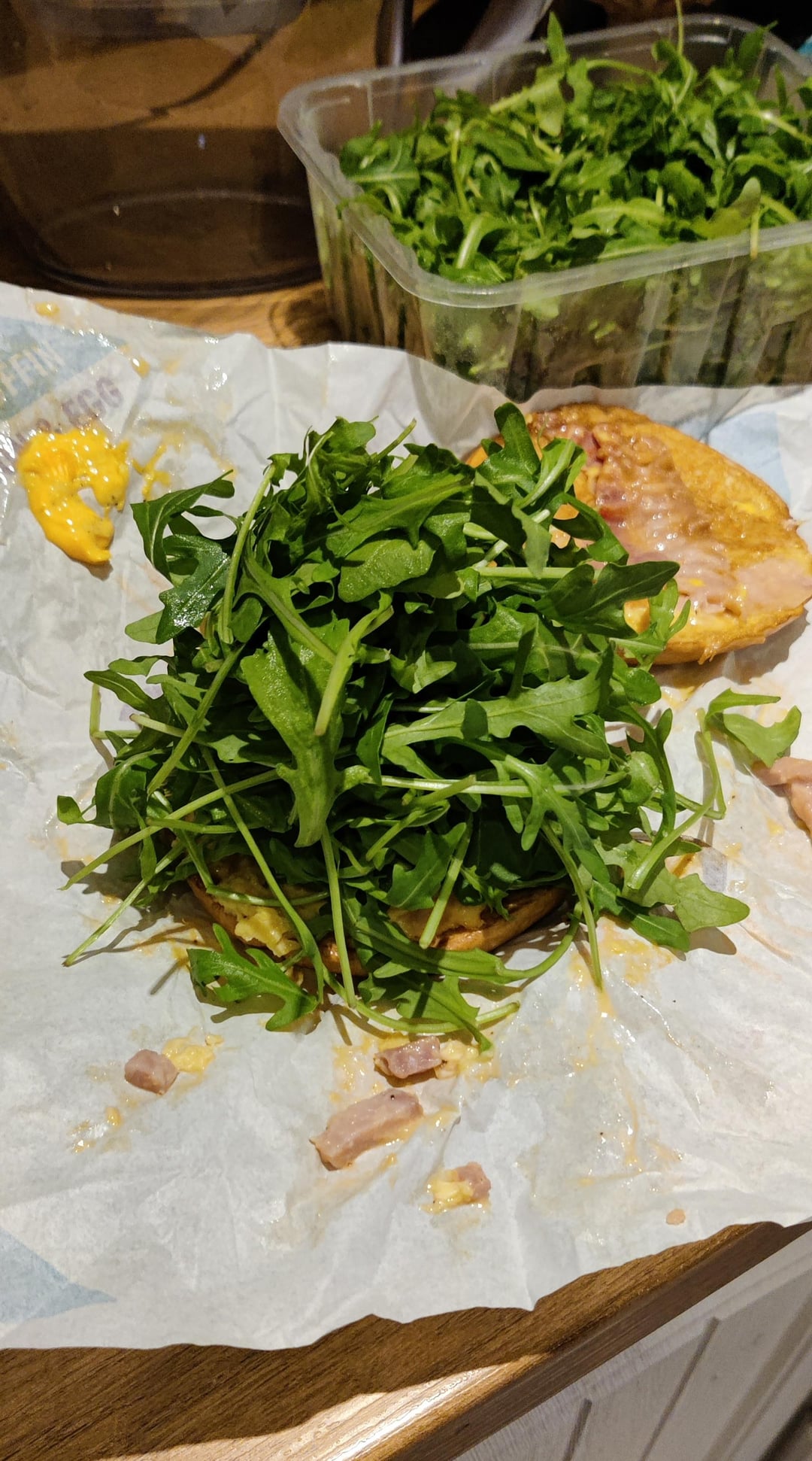 Così sono andata da Tesco a prendere la rucola (lavata), e la casa ha preparato un bagel secondo le sue esigenze, il mio Crunchy Rukolamax Bagel Supreme™.