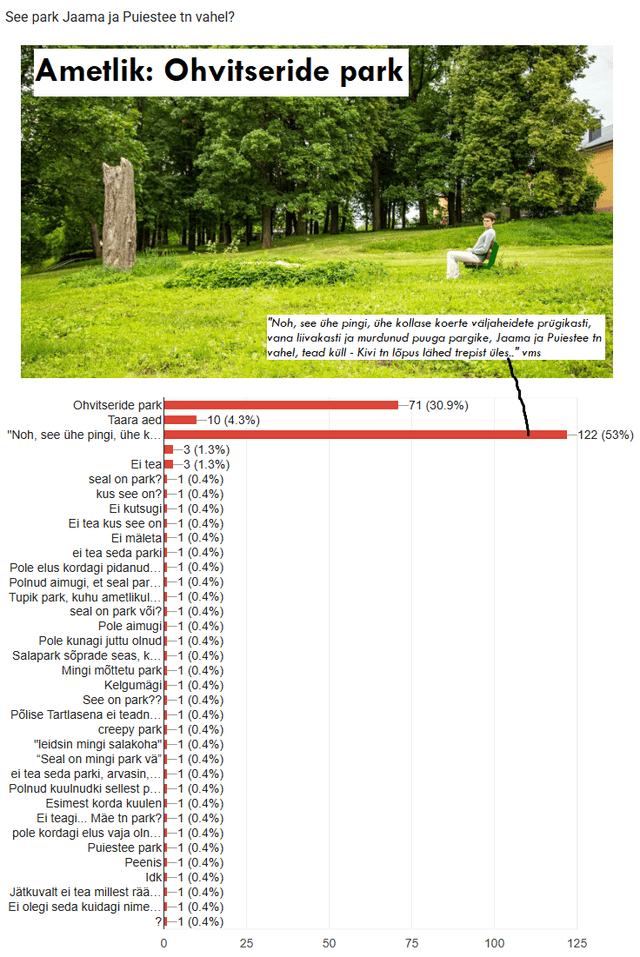 Ho aggiunto queste risposte se più di una persona ha risposto in questo modo (cioè anche sotto Altro/Muu, se la persona ha aggiunto la risposta da sola – tranne nel caso di Officers Park).