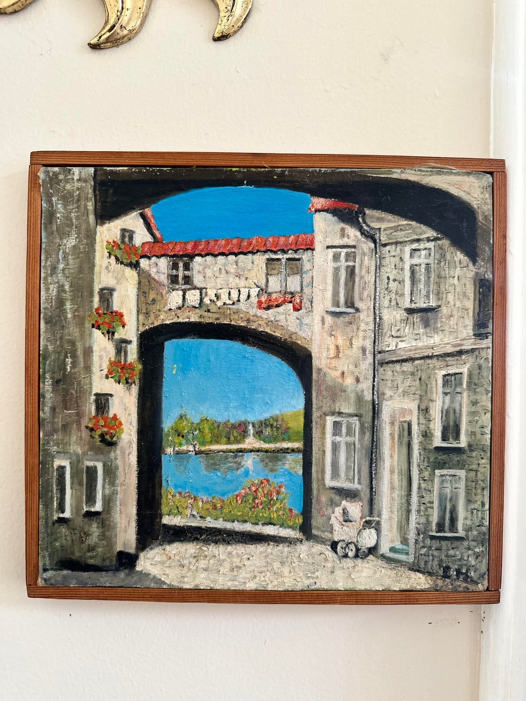 qualcuno conosce questo scenario? questo è un dipinto di mia nonna Elli Haft che visse in Germania, precisamente a Monaco. credo che questo sia stato dipinto forse negli anni ’20? o forse è stato dopo la guerra. Inoltre non riesco a capire cosa si legge sul retro. So che è un po’ difficile, ma l’anno prossimo andrò in Europa e vorrei inserire questo posto nella mia lista dei desideri