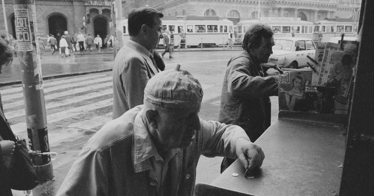 Telex képaláírás: “Vásárlók egy újságosstandnál Varsóban a kilencvenes évek elején”