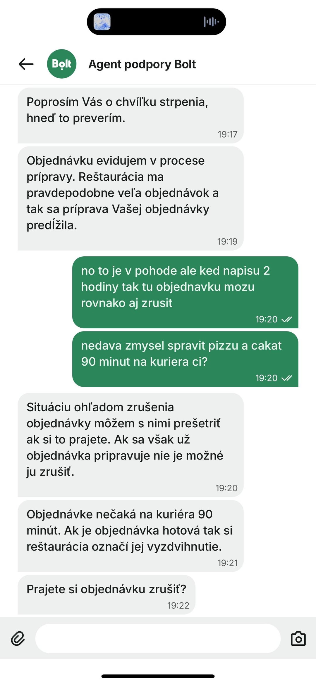 podobne sa stalo aj mne pred 1-2 mesiacmi, pretoze kurierkovi sa nechcelo cakat 5 minut na moju objednavku tak odisiel bez nej. Jedlo pripravene, ale kym dosiel druhy kurier museli mi ju prerabat lebo by uz nesplanalo standardy restauracie (mcdonalds). To co sa deje som sa dozvedel az po telefonate so samotnou restauraciou lebo bolt podpora stoji za holy kokot. Druhy kurier nevedel ani po slovensky ani anglicky…. Hned som vymazal celu appku
