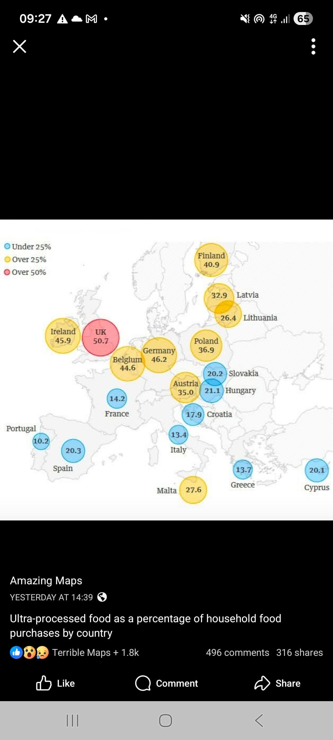 What exactly is meant with “ultra processed food” here? Also what is the source for the map? Most of those facebook posts are just AI generated slop that has no basis on anything
