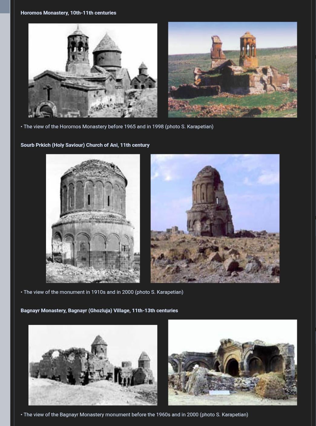 "Nel 1974 l’UNESCO dichiarò che dopo il 1923, dei 913 monumenti storici armeni rimasti nella Turchia orientale, 464 sono scomparsi completamente, 252 sono in rovina e 197 necessitano di riparazioni. Gli edifici architettonici armeni vengono costantemente demoliti utilizzando la dinamina e vengono utilizzati come obiettivi durante le esercitazioni di addestramento militare turco; le pietre non danneggiate vengono utilizzate come materiali da costruzione. In alcuni luoghi rurali, i monasteri e le chiese armeni fungono da stalle, negozi, club e, in un caso, anche da prigione. In molte occasioni il governo turco ha convertito le chiese armene in moschee."