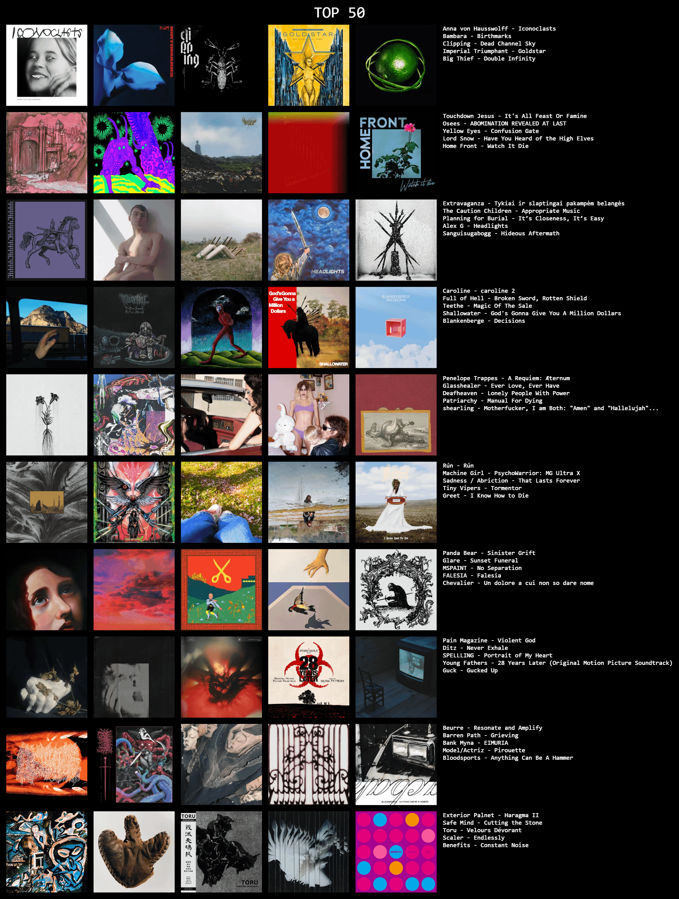 Ecco i miei 50 album preferiti di quest’anno. Non esiste un ordine vero e proprio, ma sono abbastanza sicuro che questo primo, quindi Iconoclast di Anne von Hausswolff, sia molto probabilmente il mio AOTY. Tuttavia, la situazione sembra cambiare man mano che scopro nuovi album dell’anno scorso. Quindi, se a qualcuno manca nuova musica, ecco alcuni suggerimenti.