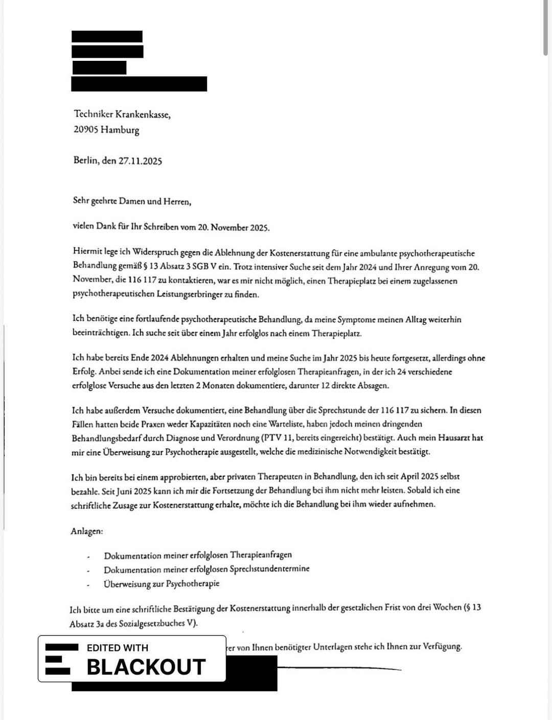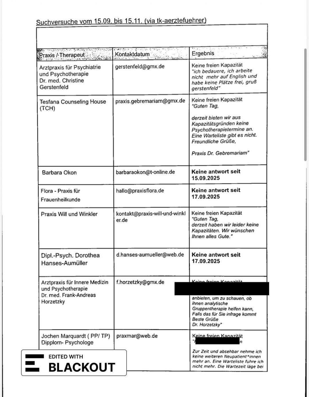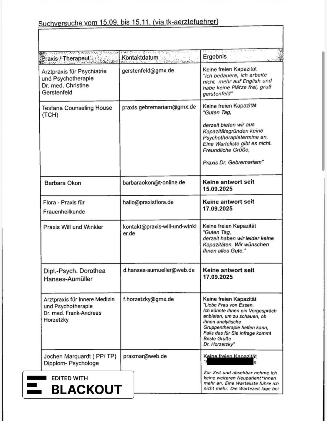 Nel giro di 2 mesi ho documentato 24 tentativi di rifiuto/richiesta, 2 visite sprechstunde tramite il 116 117 e 2 prescrizioni per cure psichiatriche necessarie dal mio hausartzt e da uno psichiatra d’urgenza. Ho presentato questa documentazione con il mio PTV 11 e la spiegazione del mio caso (necessità di terapia, mancanza di spazio negli studi coperti da TK nel raggio di 3km da me). L’hanno rifiutato con la ragione che ci sono più di 50 pratiche sotto TK nel mio distretto e che il mio tentativo di ricerca degli ultimi 6 mesi non ha dimostrato un fallimento del sistema.