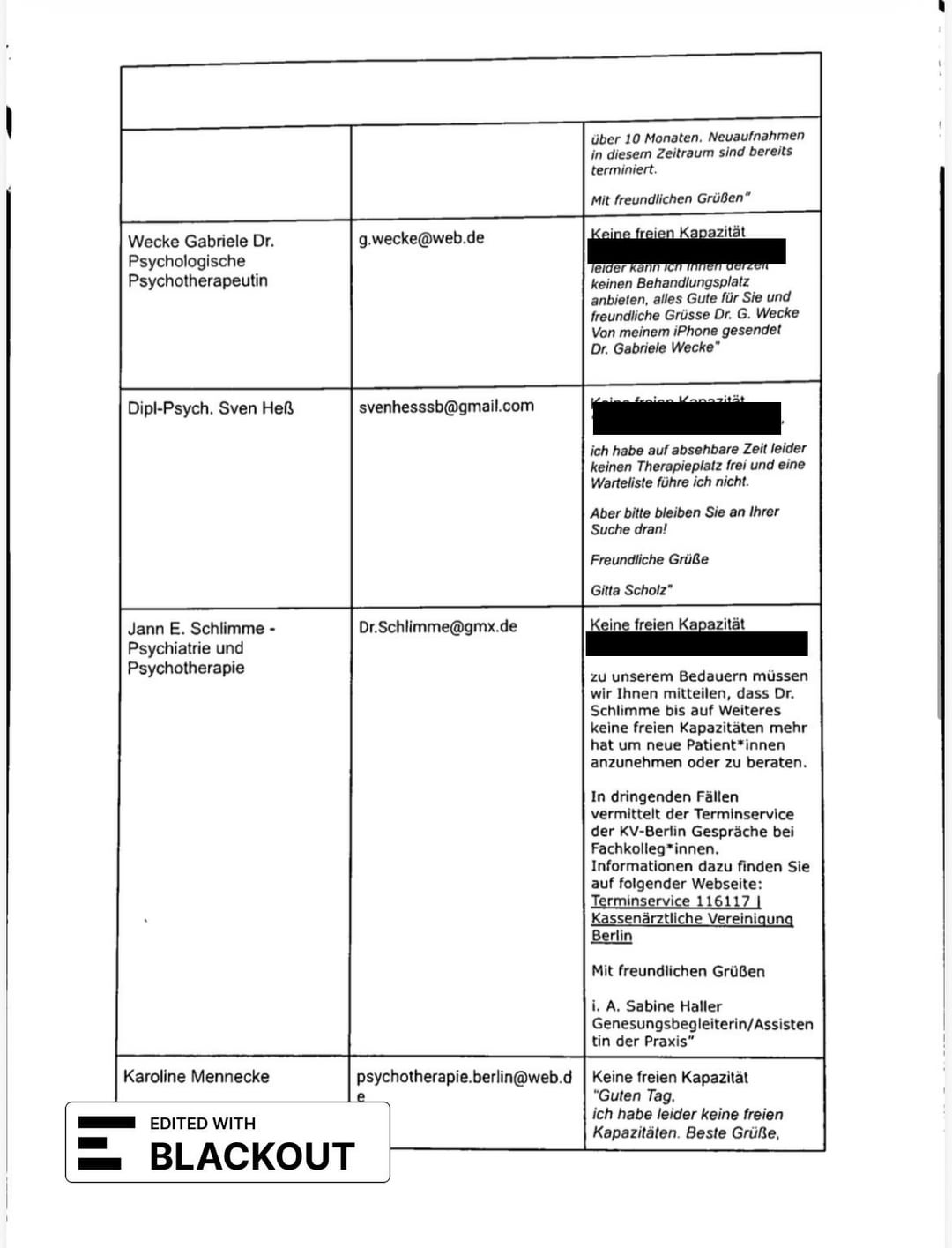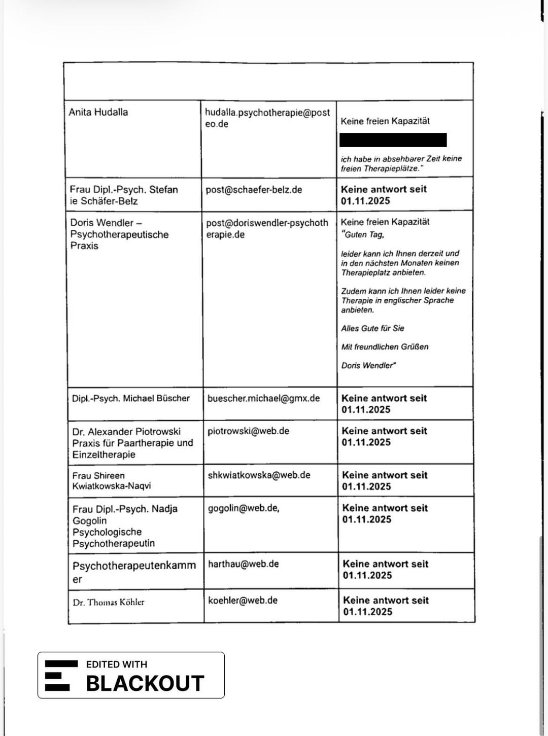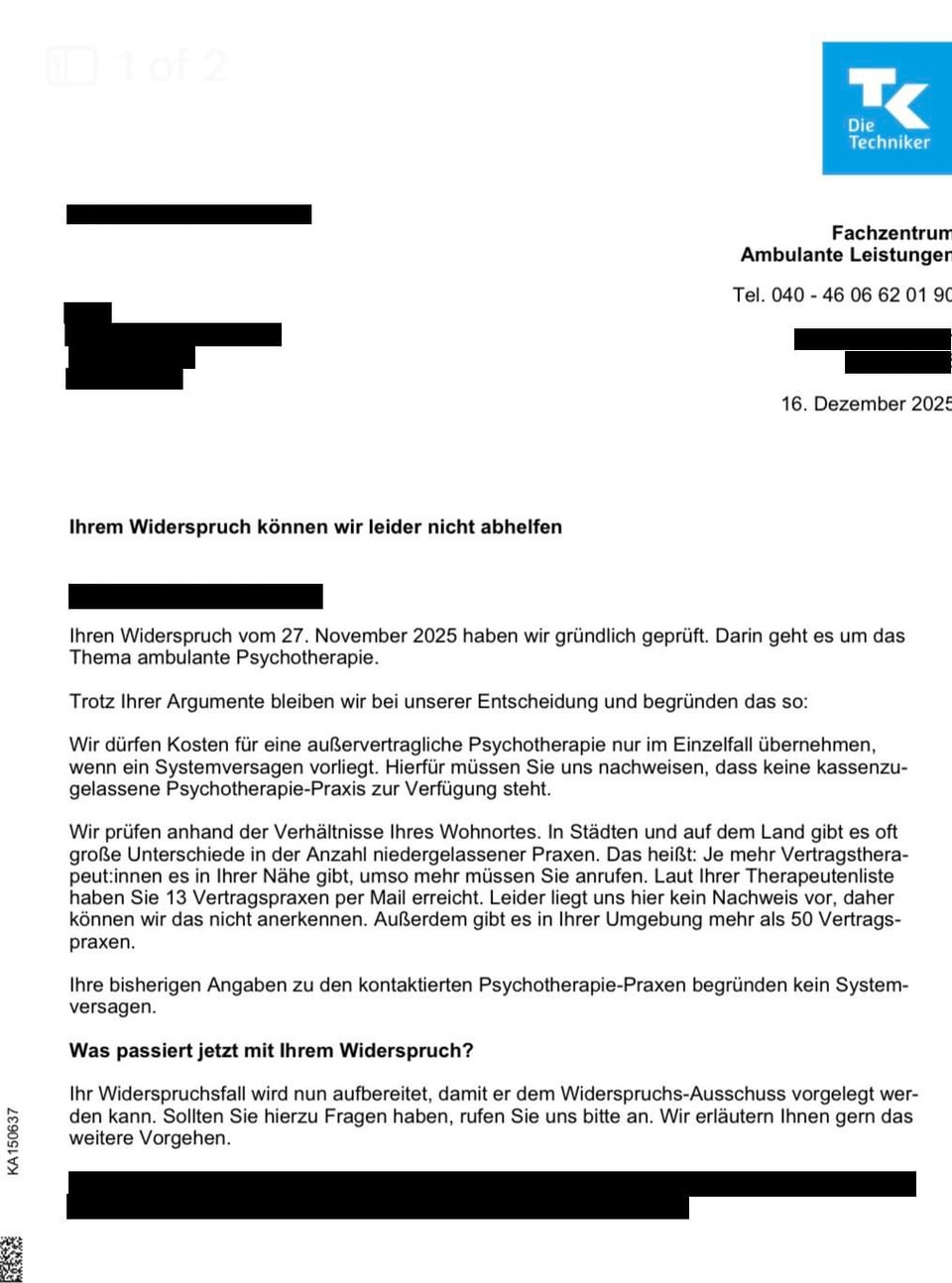 Nel giro di 2 mesi ho documentato 24 tentativi di rifiuto/richiesta, 2 visite sprechstunde tramite il 116 117 e 2 prescrizioni per cure psichiatriche necessarie dal mio hausartzt e da uno psichiatra d’urgenza. Ho presentato questa documentazione con il mio PTV 11 e la spiegazione del mio caso (necessità di terapia, mancanza di spazio negli studi coperti da TK nel raggio di 3km da me). L’hanno rifiutato con la ragione che ci sono più di 50 pratiche sotto TK nel mio distretto e che il mio tentativo di ricerca degli ultimi 6 mesi non ha dimostrato un fallimento del sistema.