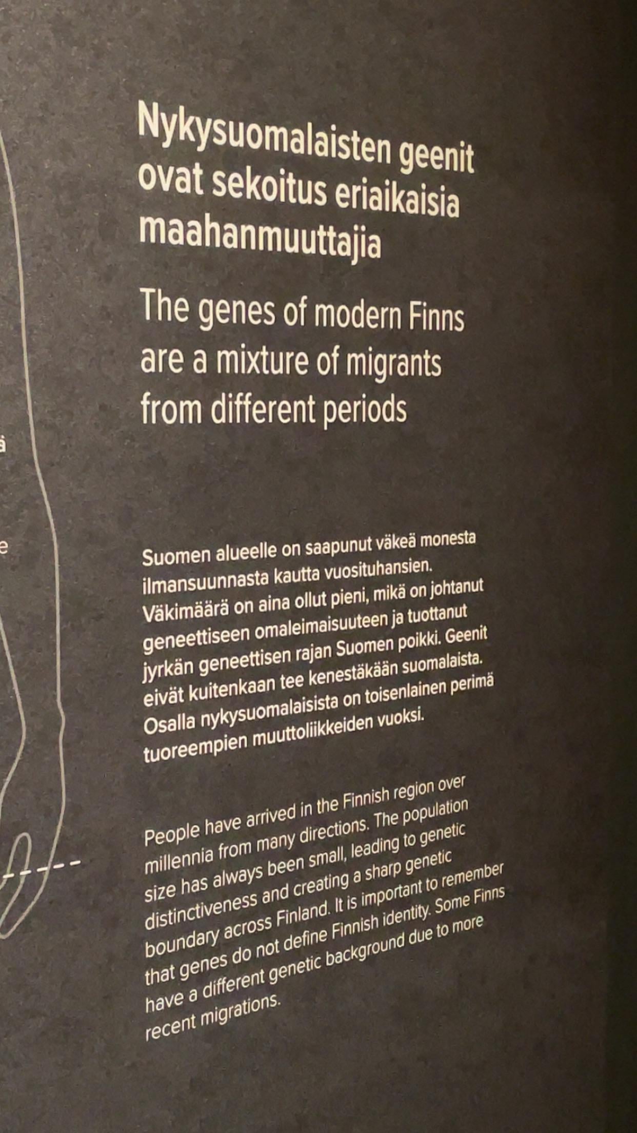 Durante l’estate ho visitato il museo di storia, dove avevano una mostra sul DNA antico. Stavo passeggiando guardando i manufatti e leggendo la storia, tra cui c’è scritto “È importante ricordare che i geni non definiscono l’identità finlandese”.