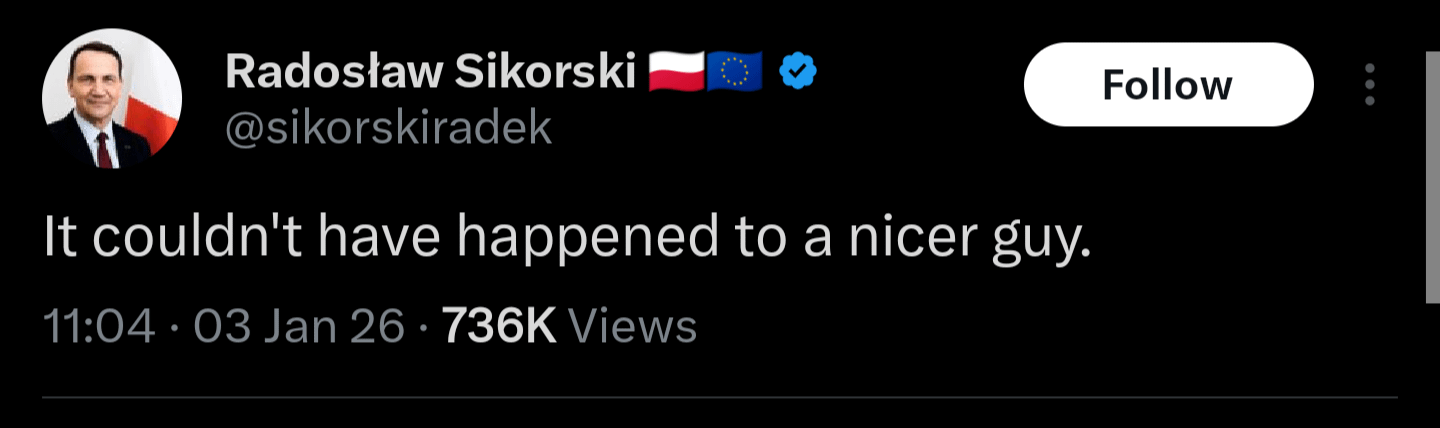 Opinione personale: da un lato va bene, perché Maduro è un dittatore che sta trascinando verso il basso il Venezuela. D’altro canto, si tratta di una reazione terribile, dal momento che l’amministrazione Trump ha violato il diritto internazionale e ha dato alla Russia un motivo di fatto per invadere l’Ucraina come parte della lotta contro l’imperialismo occidentale. Sikorski continua a spingere per un’alleanza con gli Stati Uniti, invece di concentrarsi maggiormente sulla cooperazione con l’Europa.