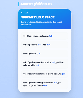 Stavo lavorando su un piccolo strumento web che mostra semplicemente i passaggi dell’abluzione e della preghiera, più come promemoria visivo che come “apprendimento”. Metto uno screenshot così puoi vedere di cosa si tratta.