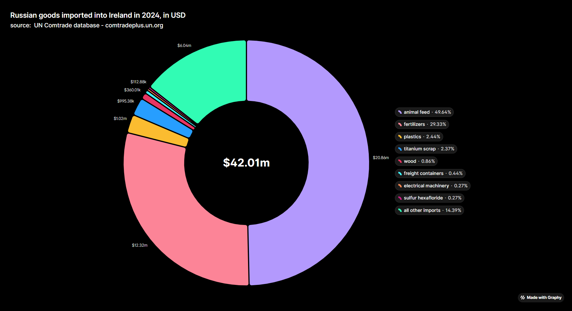 made this graph using data from comtradeplus.un.org. This is based off of customs data reported by Ireland to comtrade, there may be some errors in it. For comparison in 2021 the total imports were $709 million with $440 million of that being fossil fuels, so it’s significantly down. There was also no fossil fuel imports in 2024.