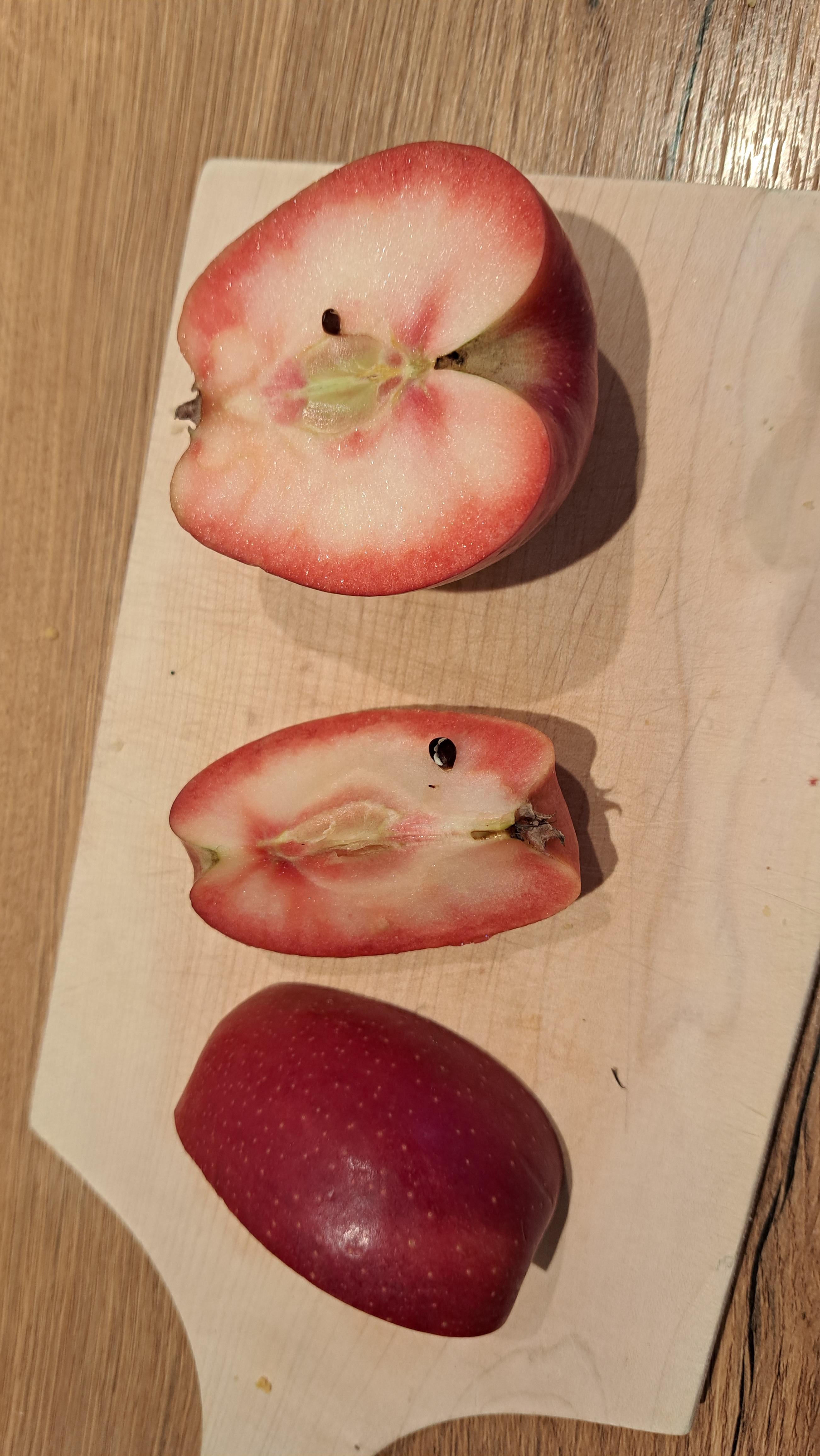 Ho appena tagliato una deliziosa mela rossa del supermercato (lidl). E guardalo, anche l’interno è rosso. Non ho mai visto nulla di simile nella mia lunga carriera. Ora mi chiedo se il colore è naturale oppure è stato aggiunto per farlo sembrare migliore?
