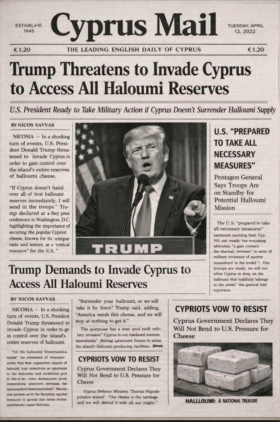 I wouldn’t worry too much about it, any invading halloumi troops he sends here, will soon realise what a great country to live in (with loads of halloumi reserves) & will probably apply for asylum 🤔