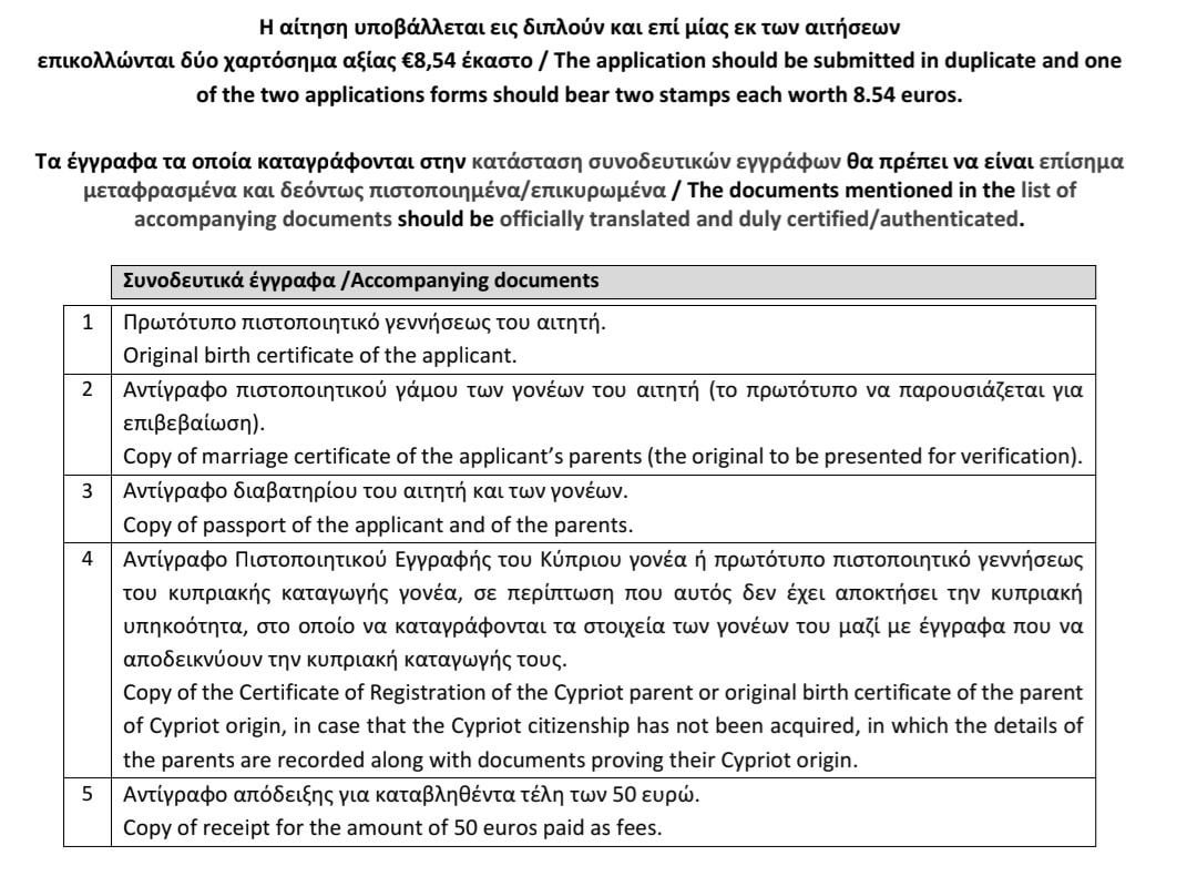 1 Your birth certificate. If you have RoC, you are already a citizen; if you were born anywhere else other than TRNC, you need that birth certificate notarized and an English translation with an apostille. If you were born in the TRNC, good luck; wait for a solution to the Cyprus issue.