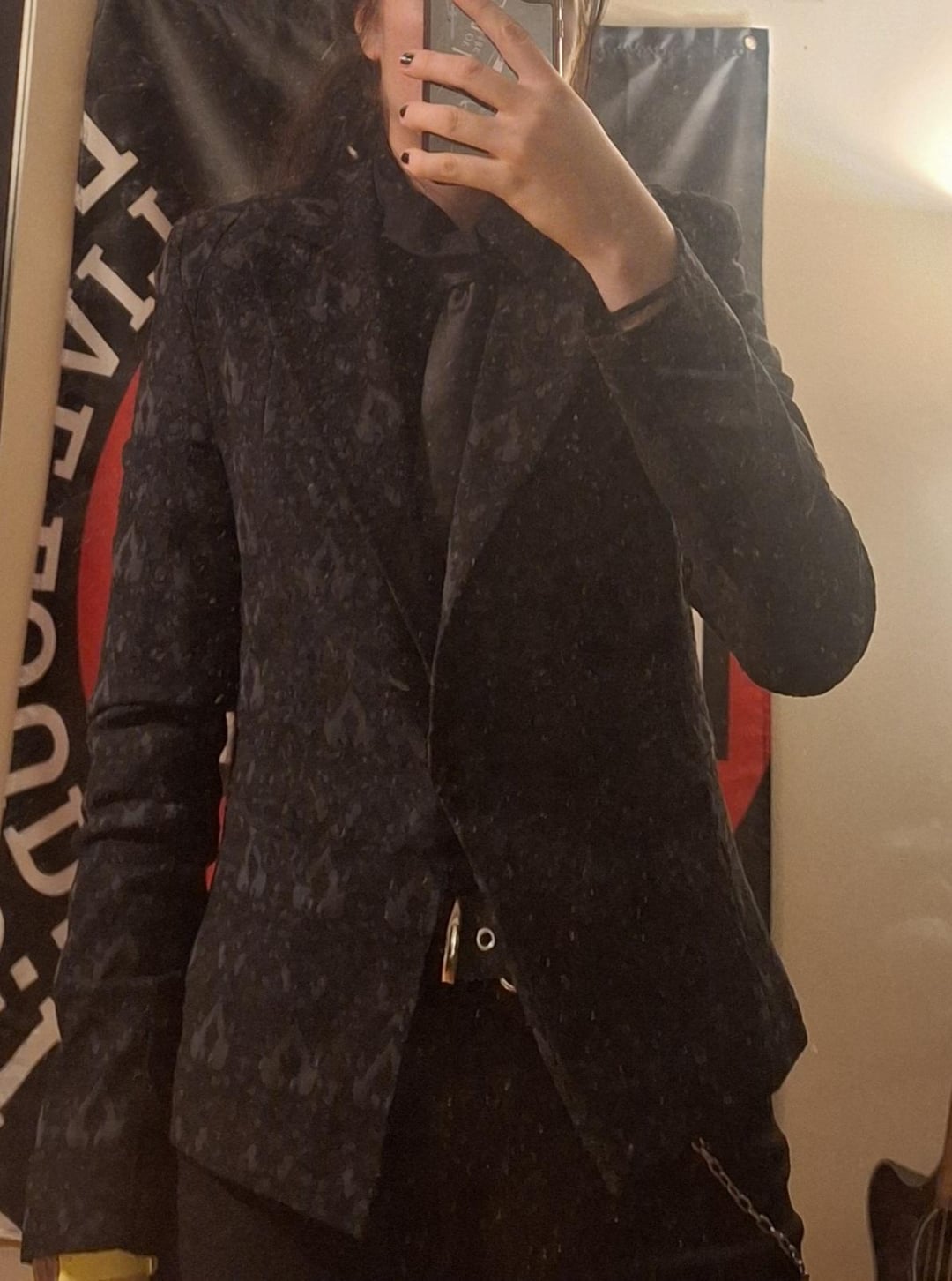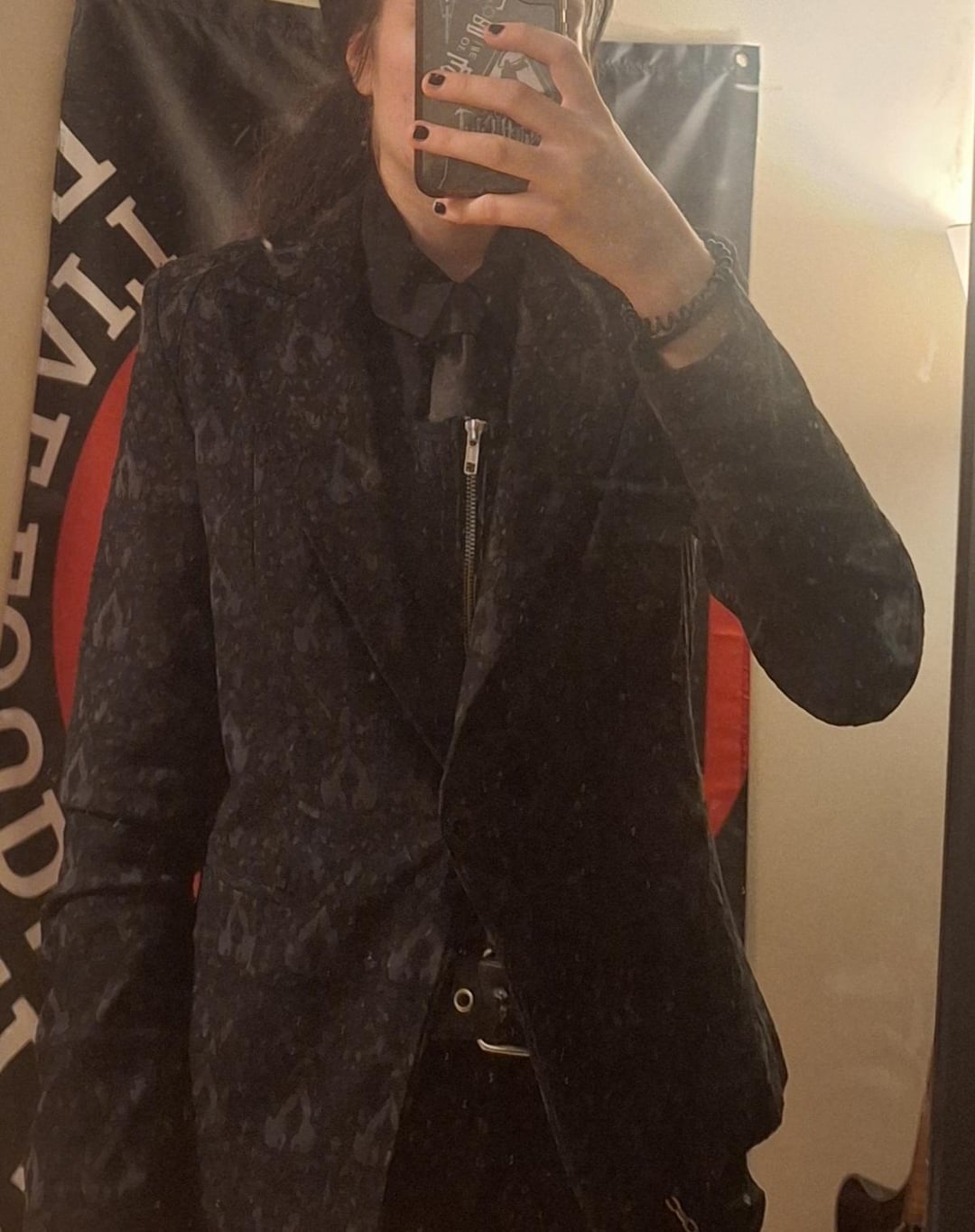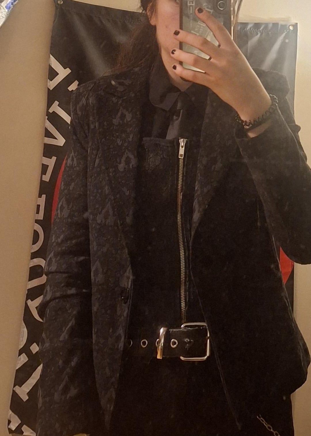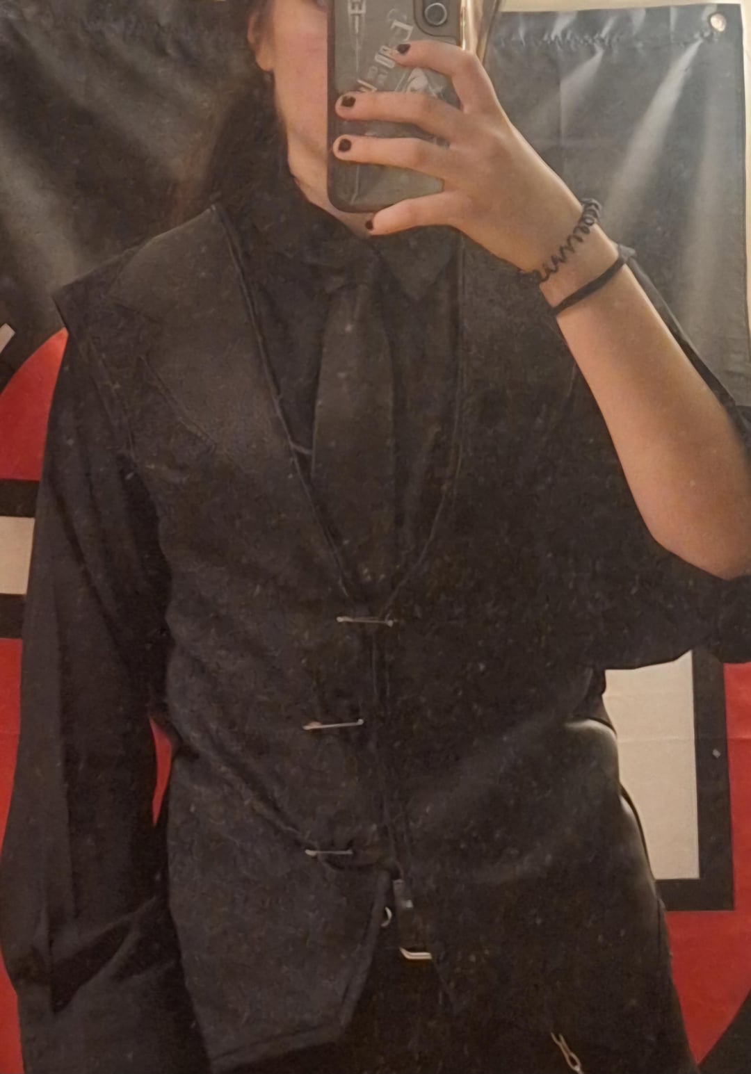 Sto decidendo tra questi due outfit, ma non sono ancora riuscita a cucire una chiusura per il gilet. Ah e in qualche modo ho messo insieme i miei pantaloni neri in modo da indossarli al posto dei jeans. So comunque che la pista da ballo nera è il posto migliore per travestirsi, quindi al ballo della scuola vorrei vestirmi come voglio, ma non voglio attirare l’attenzione. Quindi sì, quale pensi sia la scelta migliore? O dovrei indossare qualcos’altro? Grazie in anticipo 😅