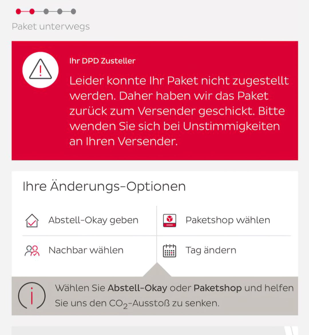 Ho ordinato da Popmart l’anno scorso e ora che è finalmente arrivato in Germania, improvvisamente sento da DPD che non sono riusciti a consegnarlo e lo stanno rispedindo a Popmart. Nessuna carta nella mia casella di posta, niente. Sono stato a casa tutto il giorno e ho aspettato. Lo so solo perché ho controllato il numero di tracciamento.