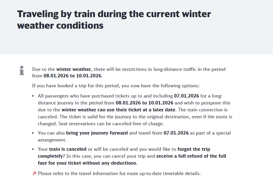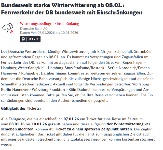 Ho visto questo annuncio nel sito web di DB, ma allo stesso tempo dice "Tutti i passeggeri che hanno acquistato i biglietti"si menziona anche, in un altro rapporto sul loro sito web, che le rotte con problemi si trovano nel nord tra Amburgo e Berlino. Quindi non sono sicuro se sia valido per tutti, o solo per le persone del Nord.