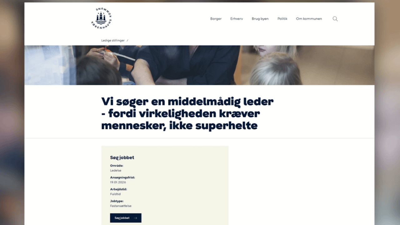 Link til jobopslaget på Københavns Kommunes hjemmeside: [Vi søger en middelmådig leder – fordi virkeligheden kræver mennesker, ikke superhelte | Københavns Kommune](https://www.kk.dk/ledigestillinger/vi-soeger-en-middelmaadig-leder-fordi-virkeligheden-kraever-mennesker-ikke-superhelte)