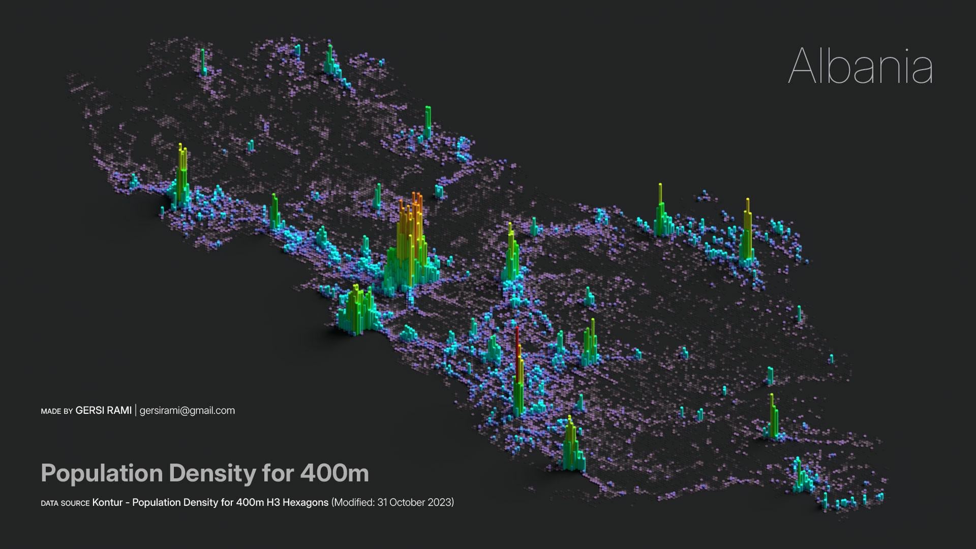 Questa è la densità di popolazione dell’Albania ogni 400 milioni, secondo i dati di Contorno. La visualizzazione dei dati è completata Miscelatore https://i.redd.it/usvm17mln4cg1.jpeg di gersirami